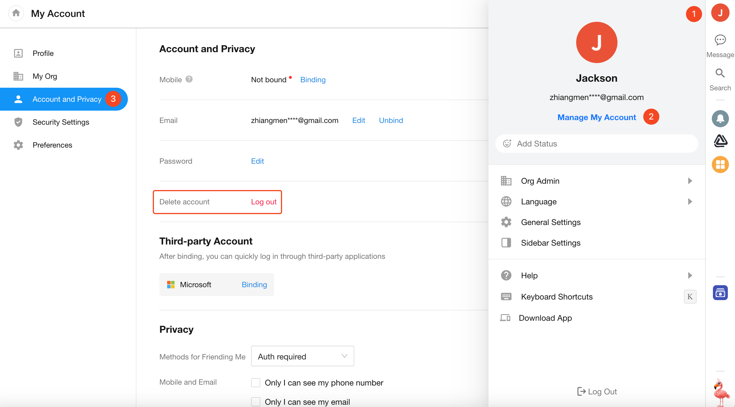 - Click your profile avatar, go to [Manage My Account] > [Account & Privacy], and click the Delete Account button.