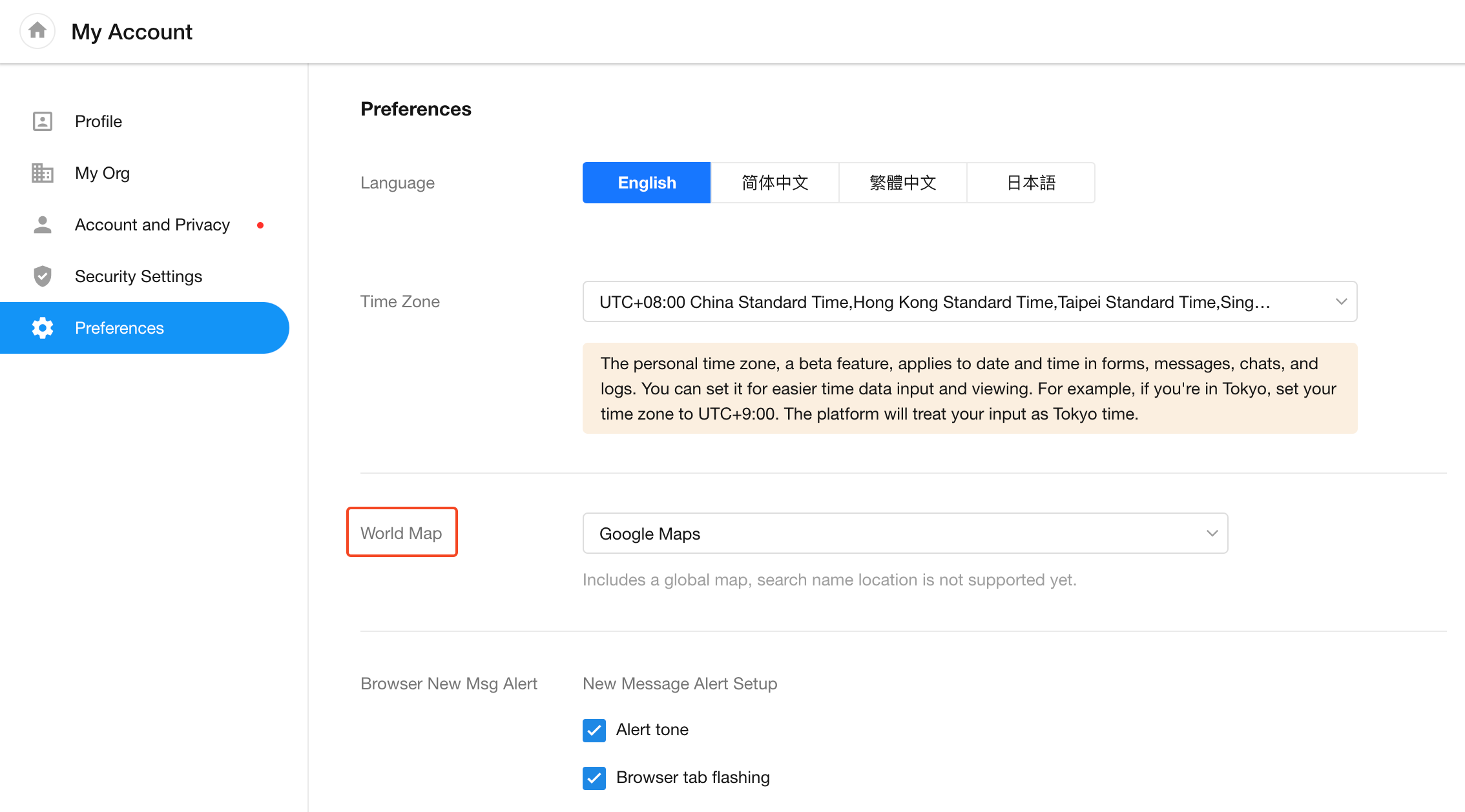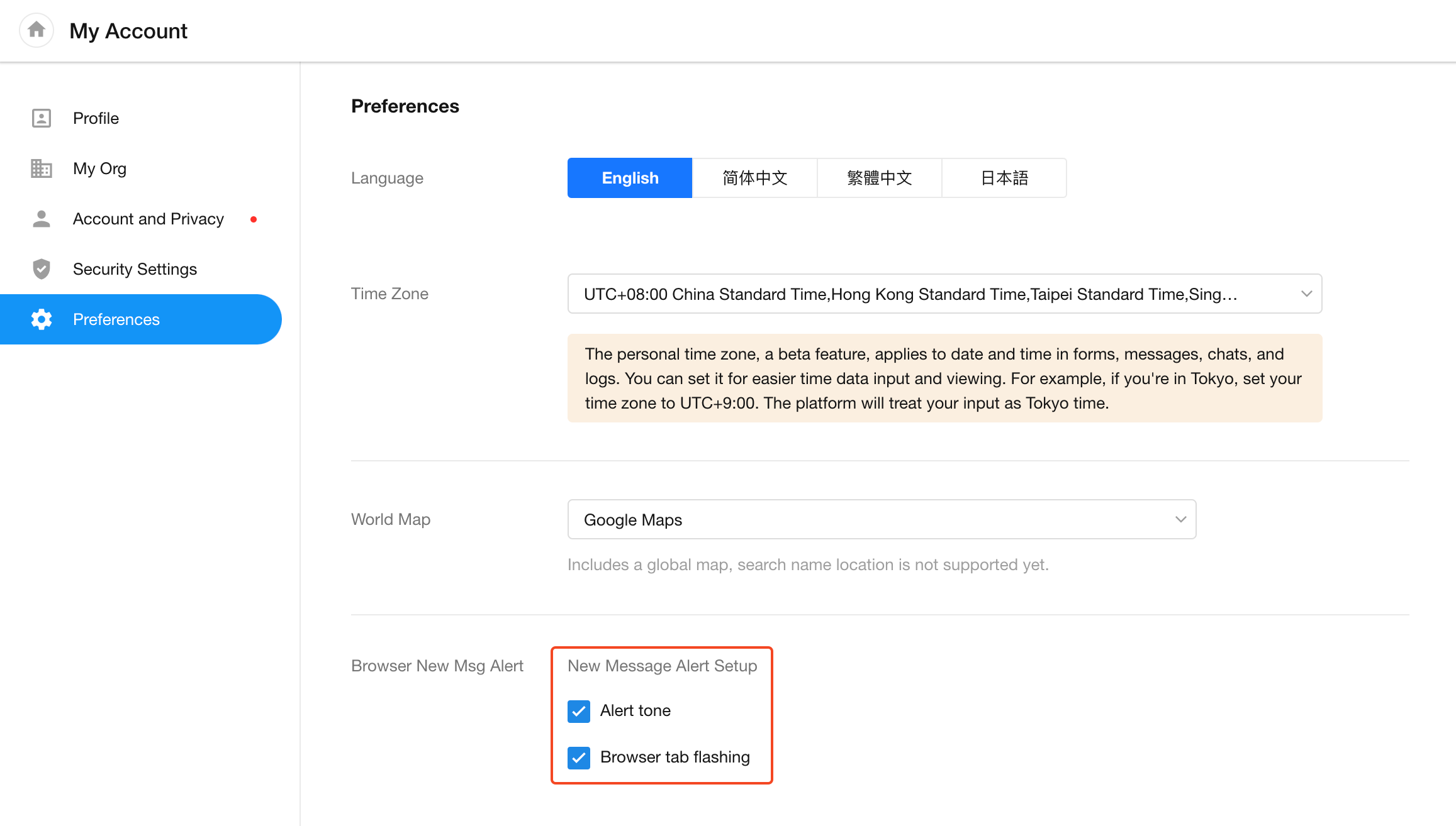 Under the Preference tab, you can customize your language, time zone, map display, browser notification preferences, and homepage navigation behavior.