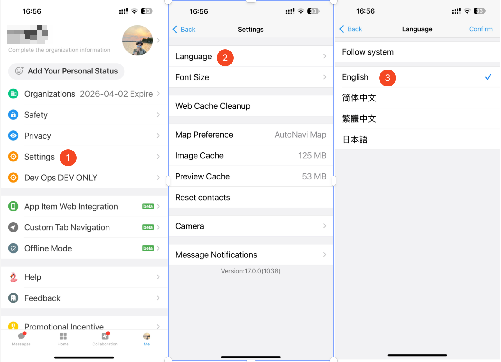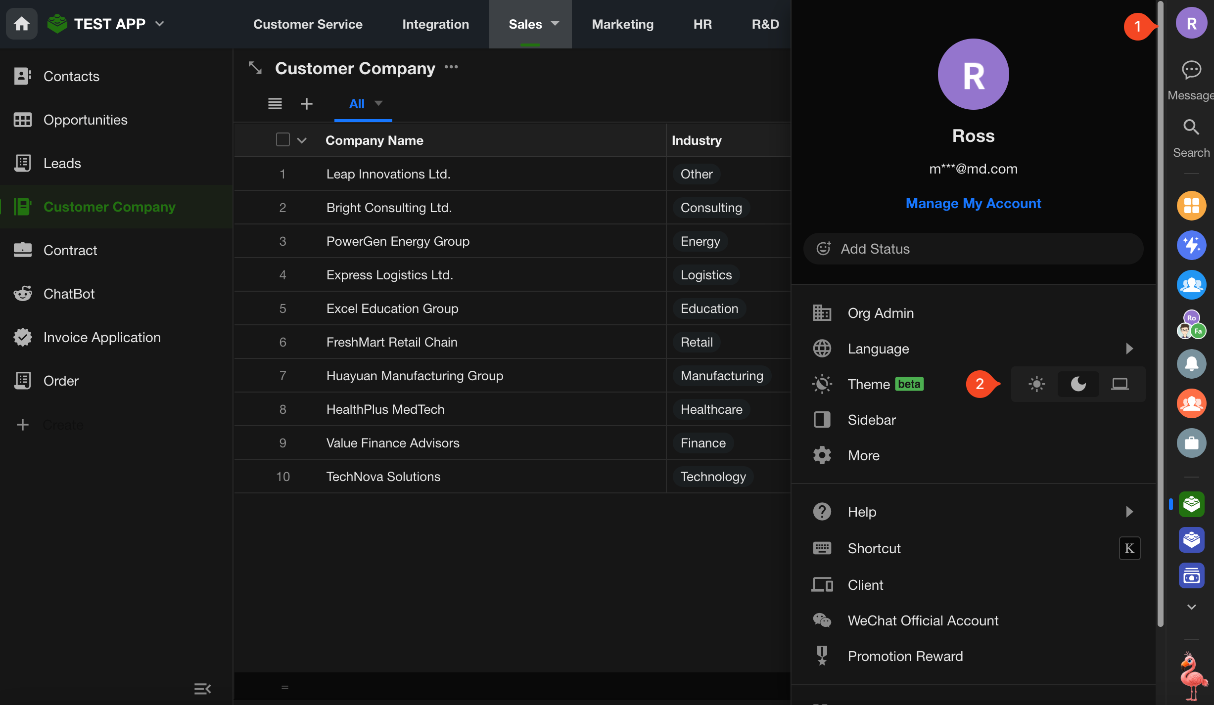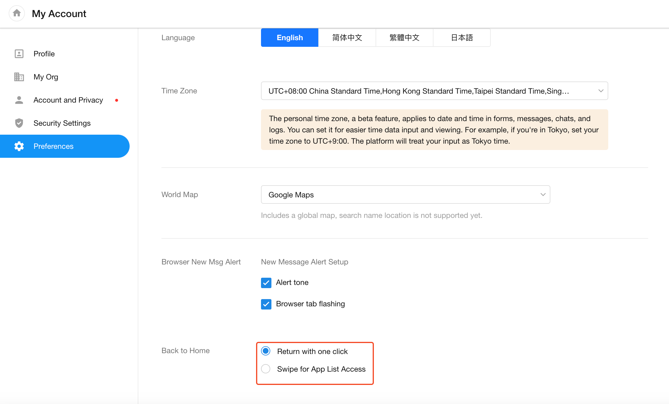 Preferences: Change system language, select time zone for date and time display, configure browser notification settings, and choose the homepage behavior when navigating within apps.