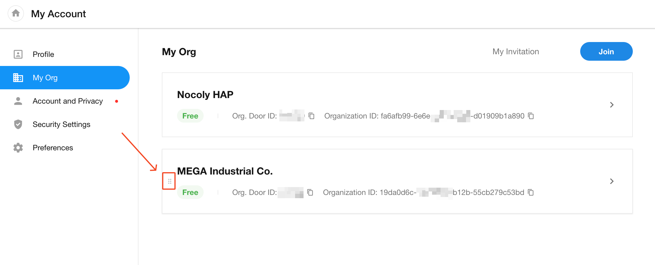 When you've joined multiple organizations, the most recently added one appears at the top by default. You can drag to rearrange the order.