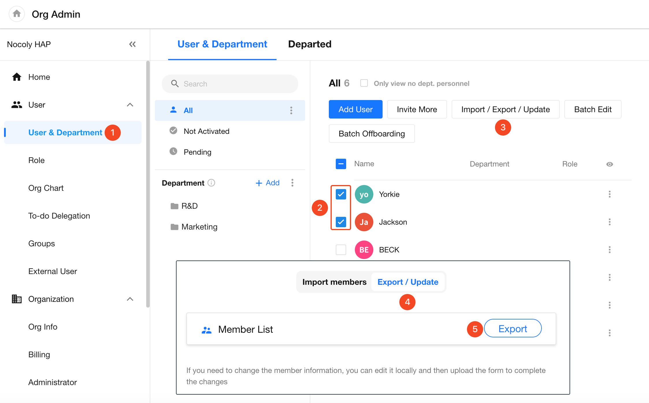 Organization administrators can export member information to Excel for bulk updates. When re-uploading the Excel file, the system uses the User ID to identify and update the correct users.
