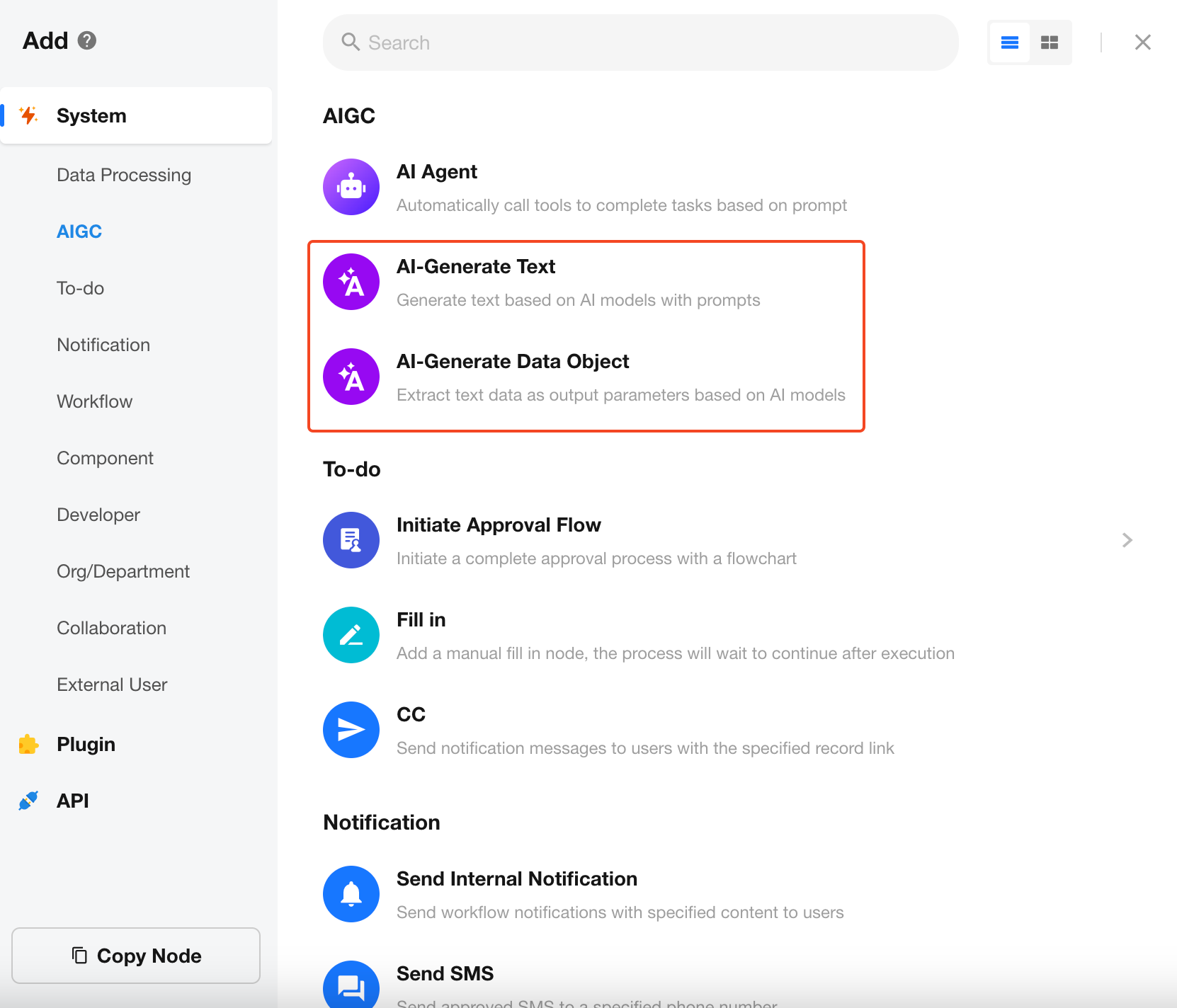 Leverage AIGC capabilities to assist with content creation and improve productivity. This includes the AI Text Generation and AI Data Object Generation workflow nodes.