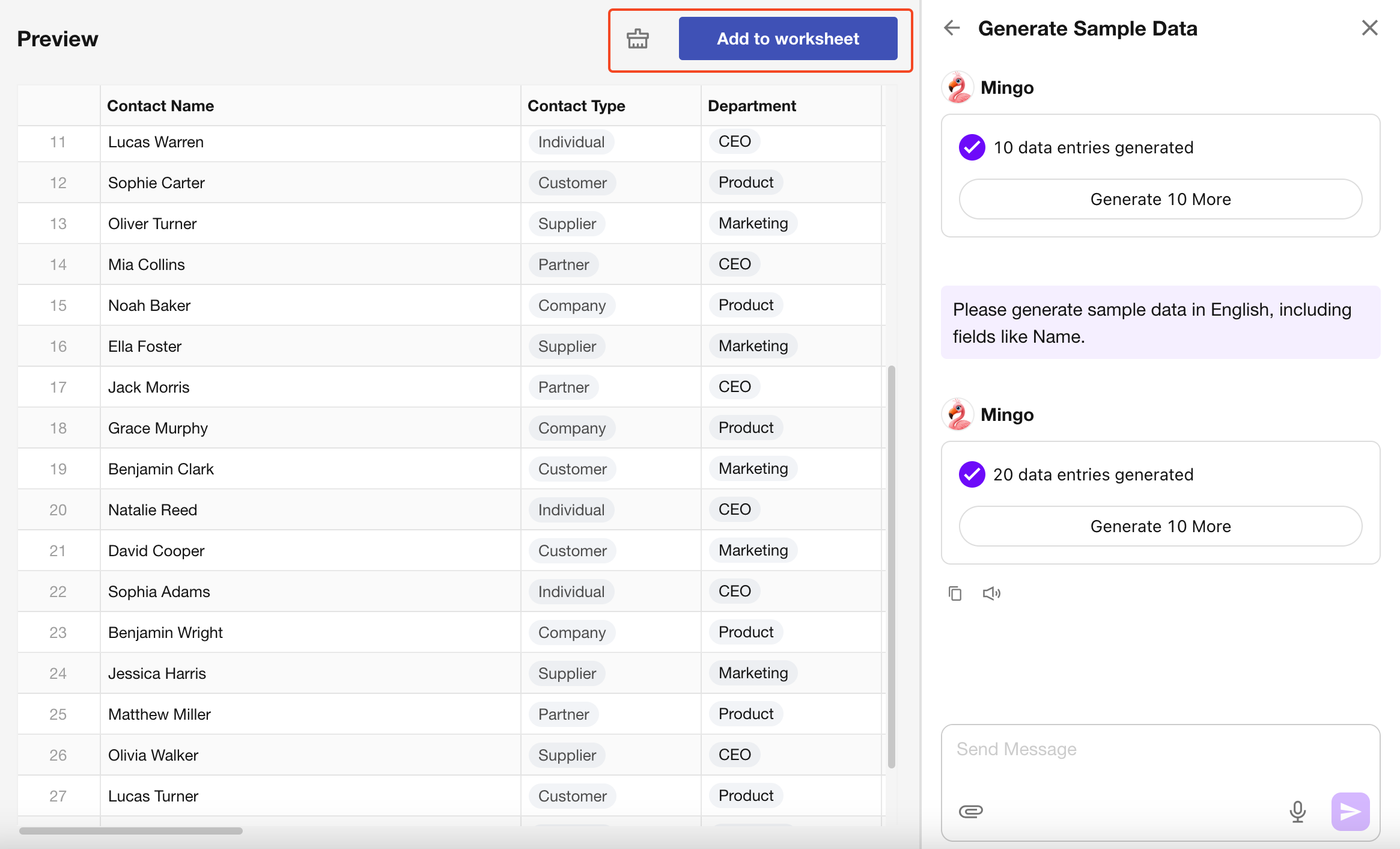 Based on user descriptions, AI can automatically create worksheets, including default icons, fields, and layout configurations.