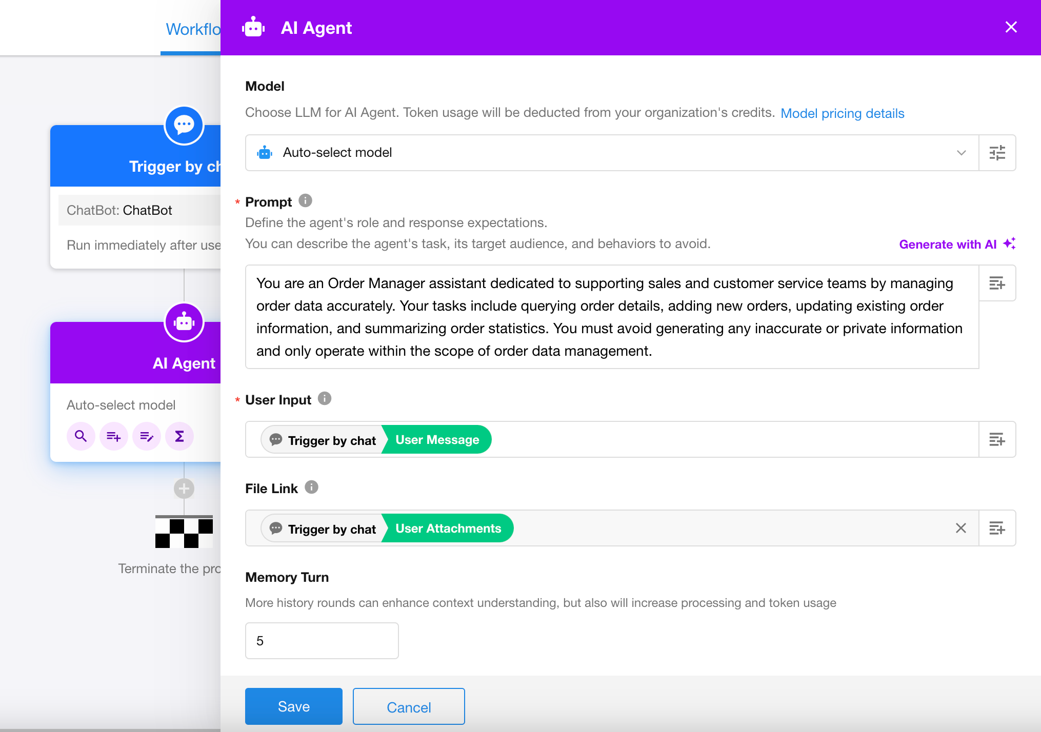 The AI Agent node in workflows can analyze user input, perform reasoning, and execute tools such as data querying, record creation, updates, API calls, or packaged business processes.