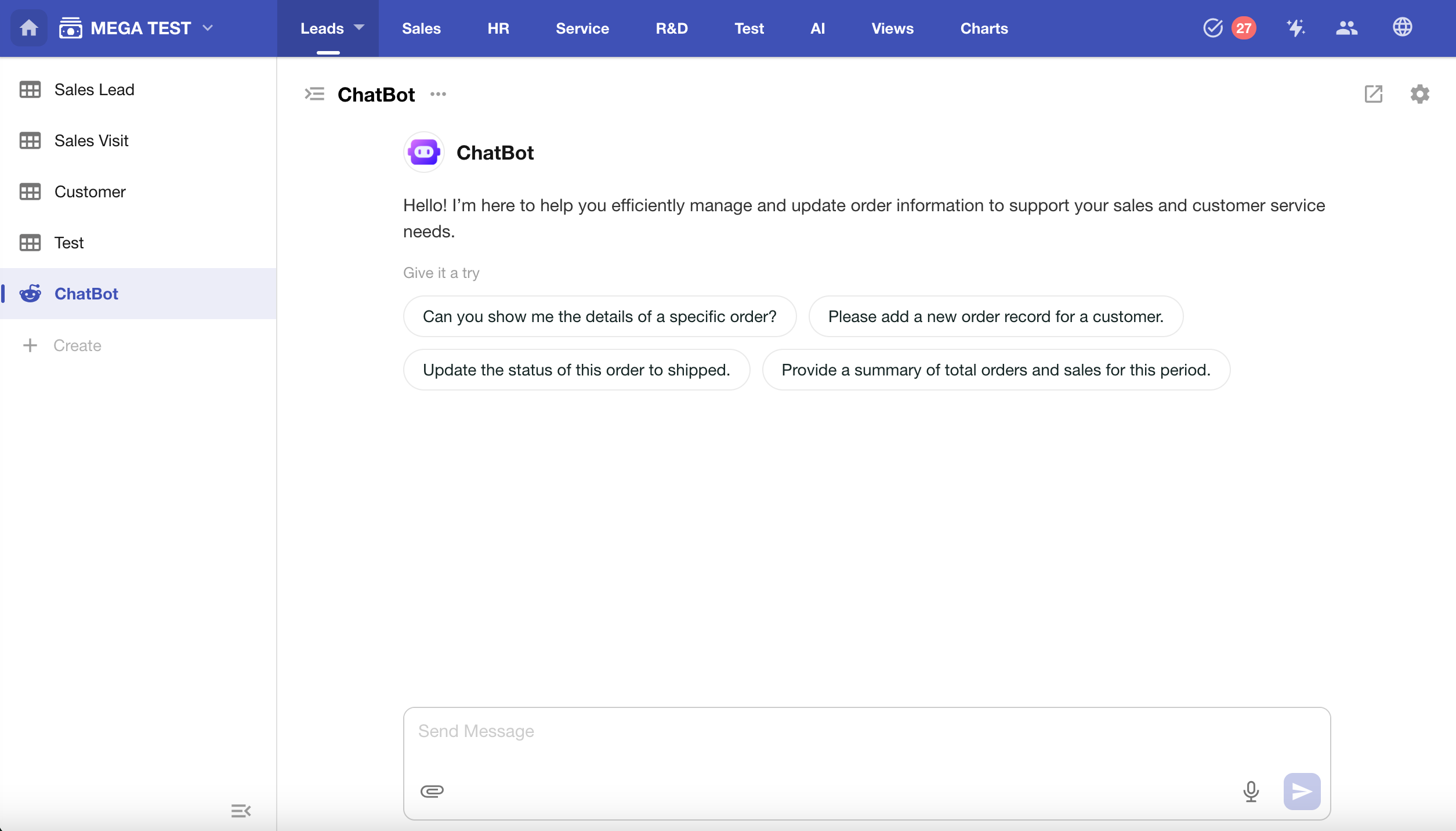 Users can interact with the ChatBot via multi-turn conversations. The ChatBot can identify user intent, perform create/update/delete operations on app data, summarize or analyze content, and drive business automation.