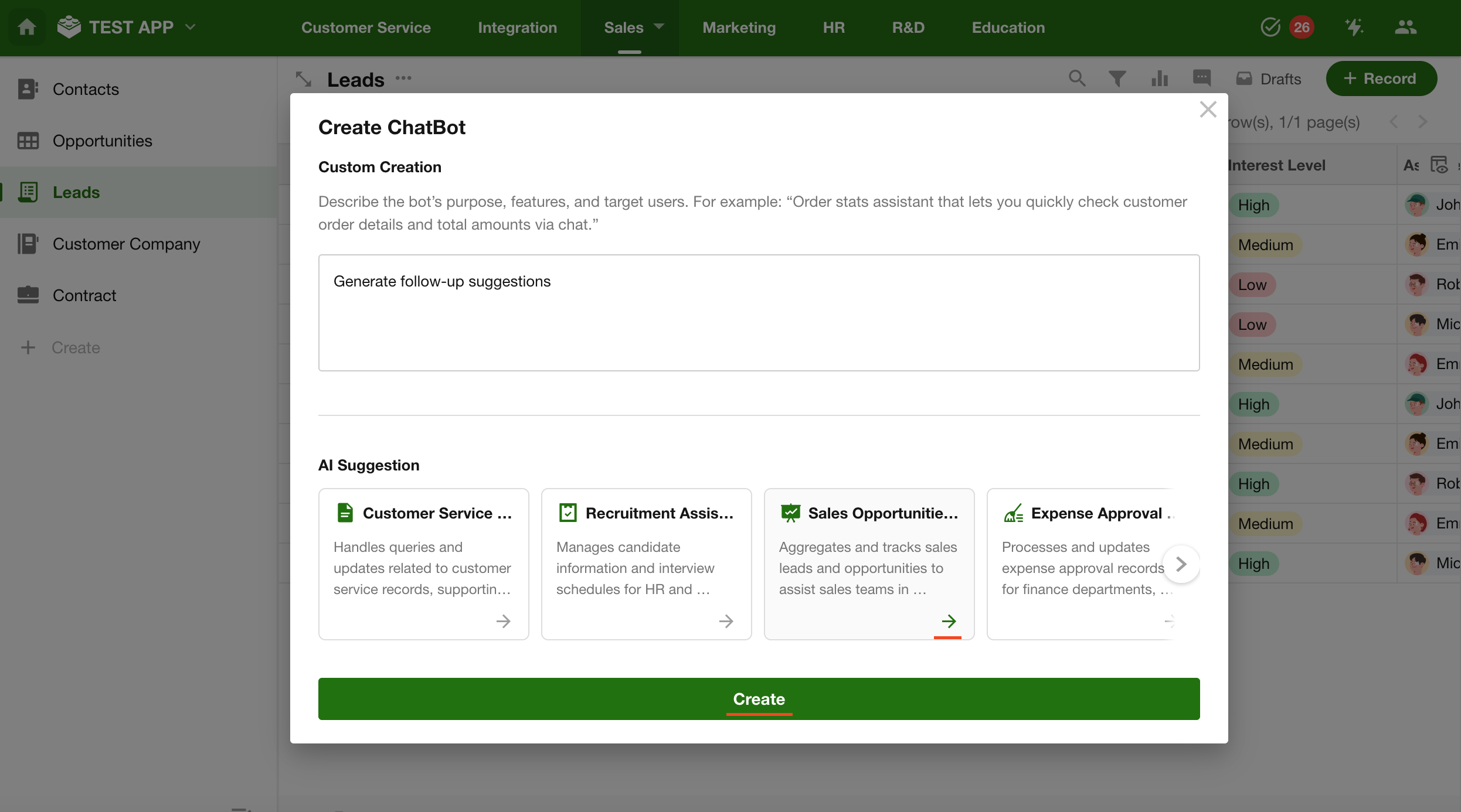 In the left navigation panel of the app, click “+ Create”, then select “ChatBot” to open the creation dialog.