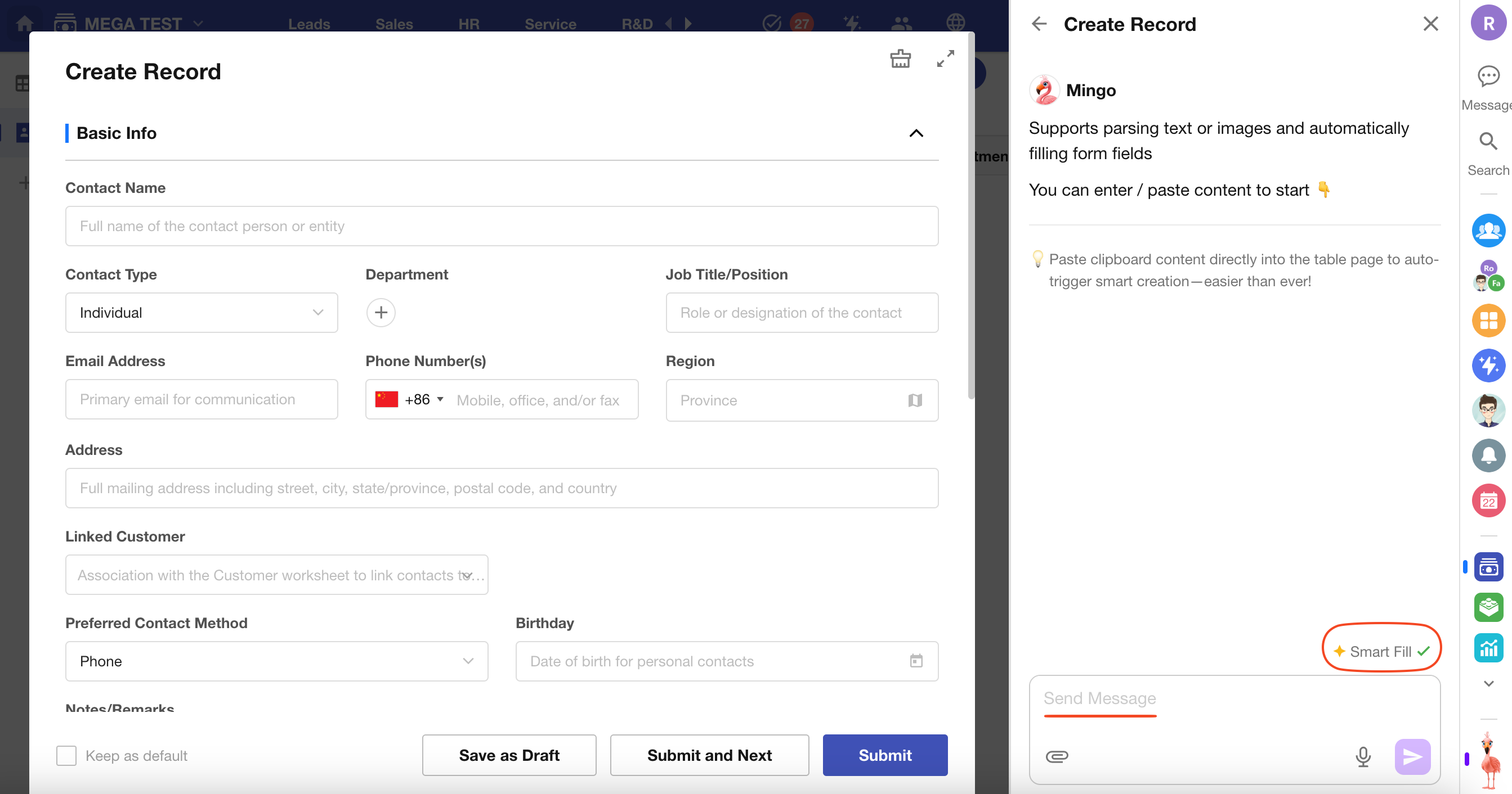 If Smart Fill is selected, Mingo will intelligently interpret your input and optionally search the web to fill in as many relevant fields as possible. Fields filled by AI will be marked with a “✨” icon.