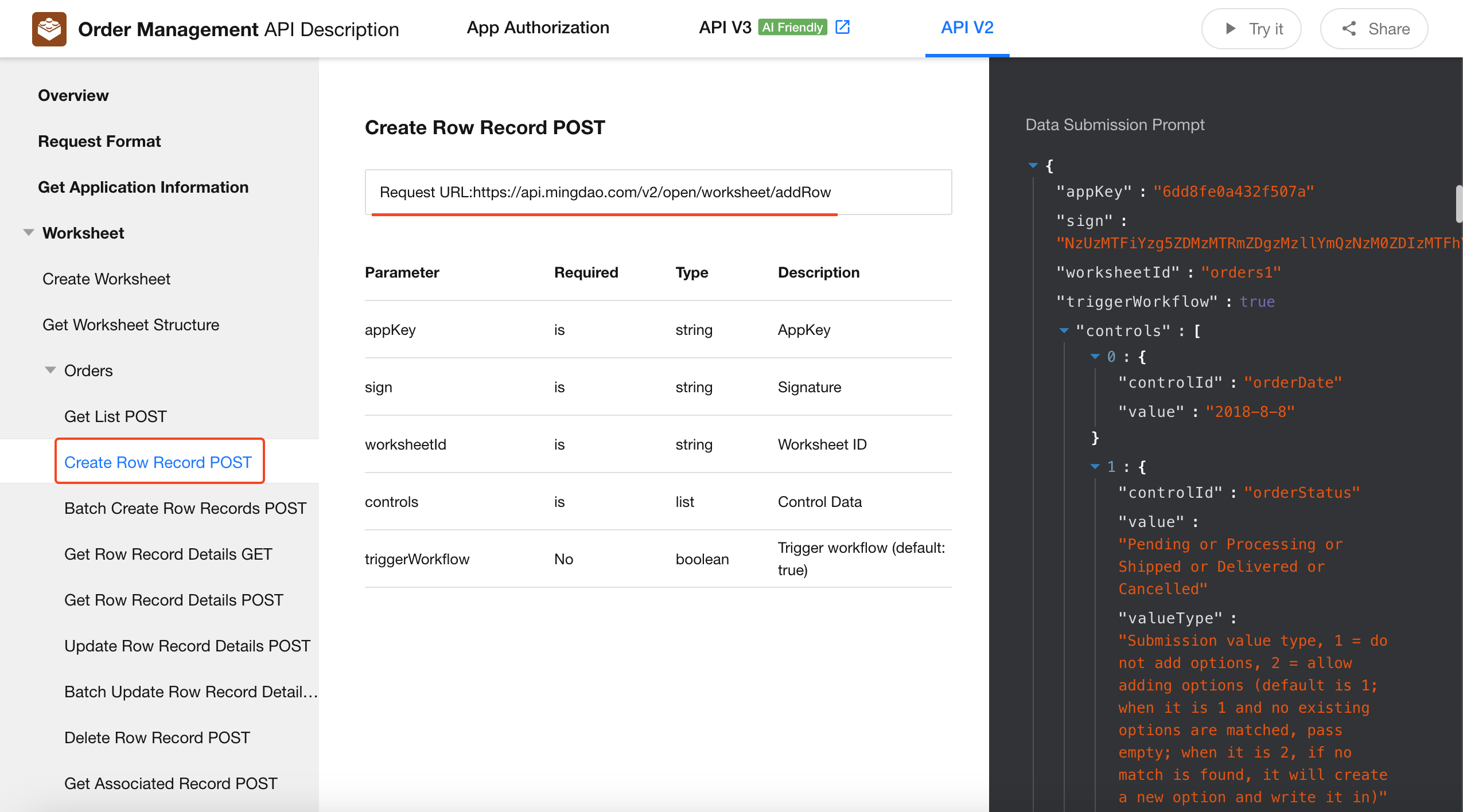 The parametersappkey,sign,worksheetid,controls, andcontrolIdcan be reused directly from the values provided on the right side of the API documentation interface.