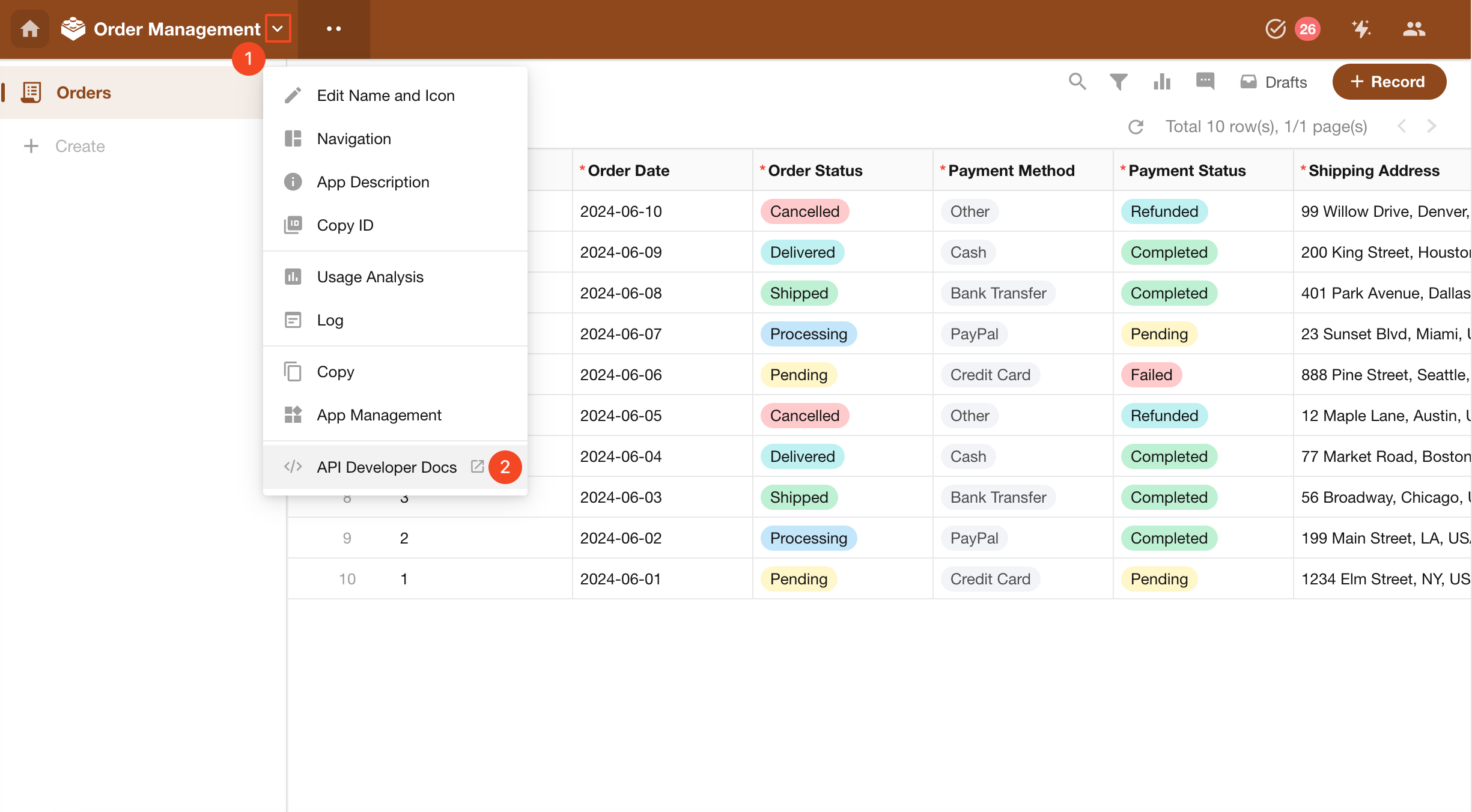 HAP provides over 10 APIs to support various data operation scenarios in an application. This section uses the Create Record API as an example, which adds a new row to a worksheet via API.