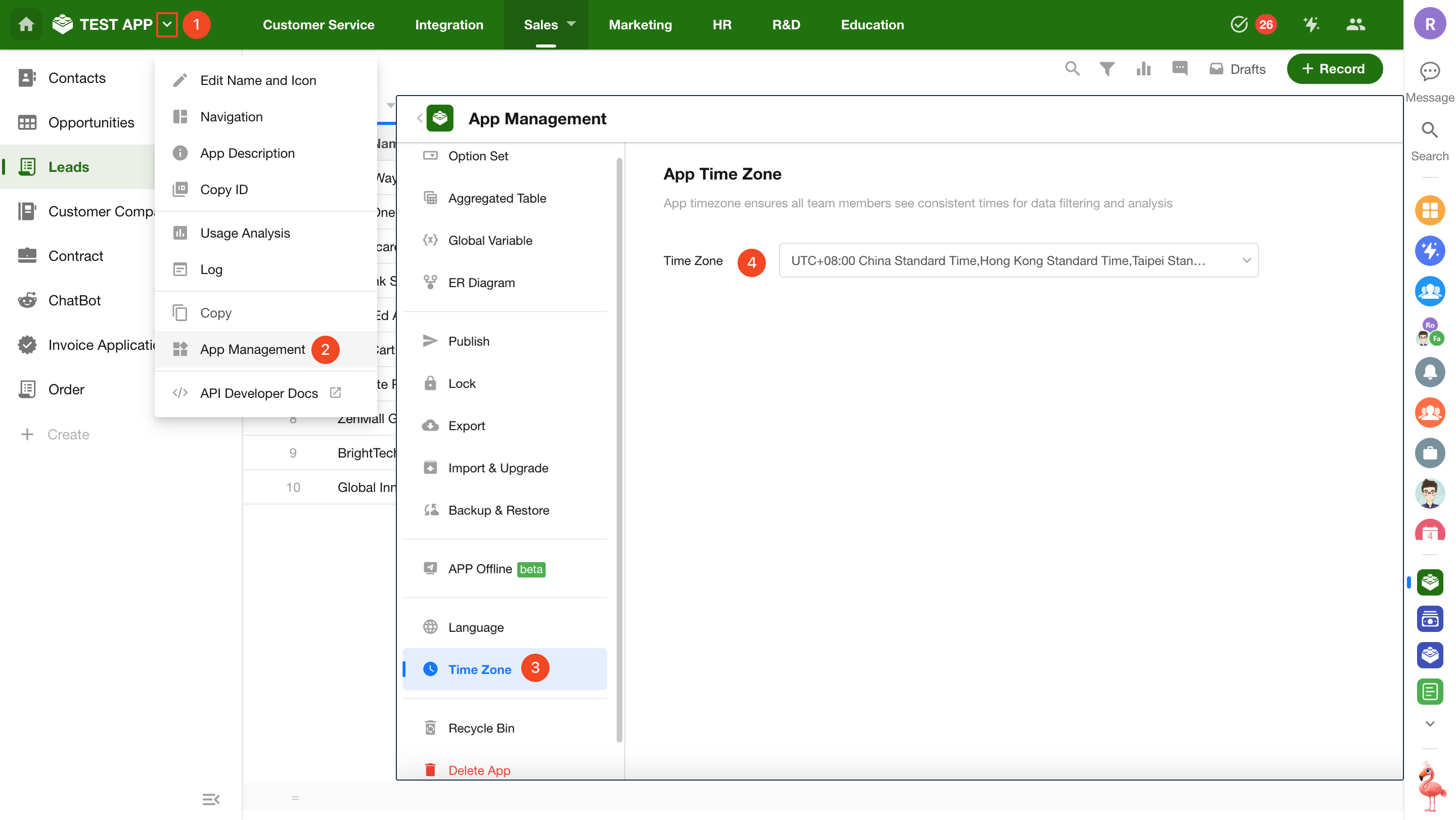 Application administrators can set the time zone by navigating to [App Management] > [Time Zone].