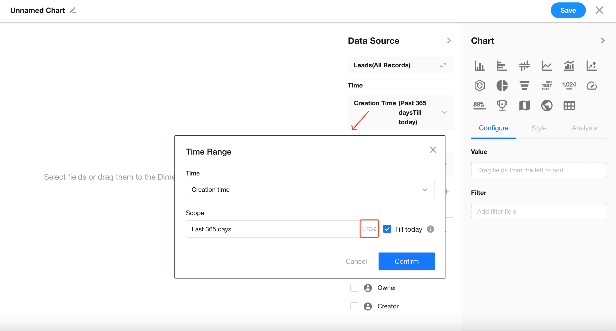 When filtering records by date/time in worksheets or charts, users will see a reminder indicating that unselected date/time values are based on the application time zone. If a user's personal time zone differs from the application time zone, a label will be shown to indicate the application time zone being used in the filter.