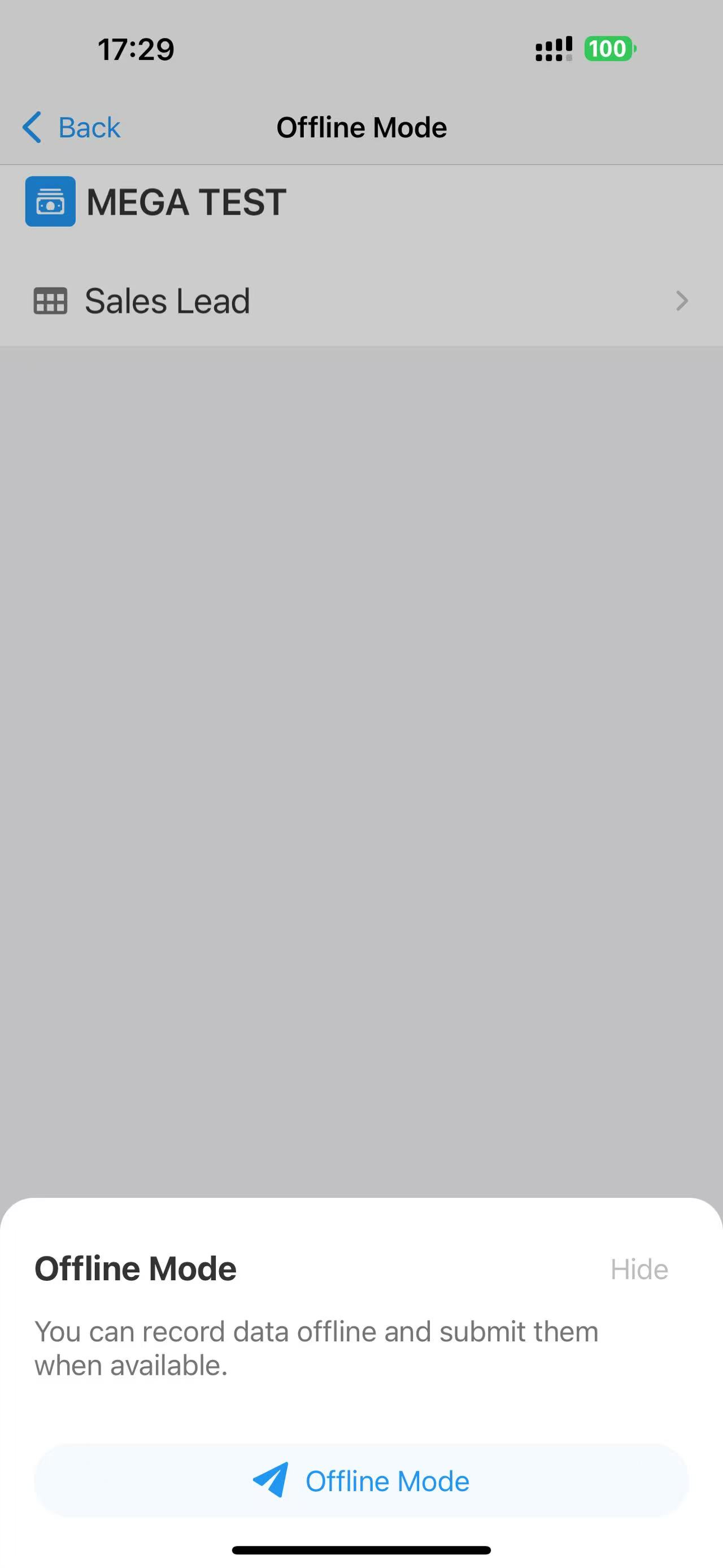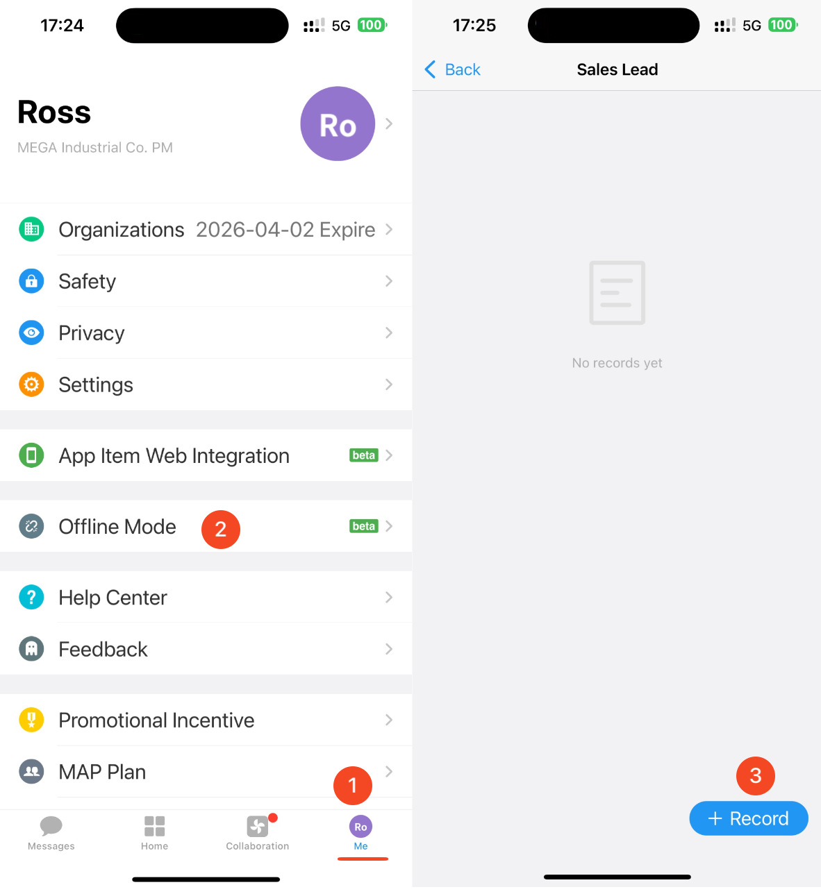 In the mobile app, tap [Me] > [Offline Mode], select the worksheet, and submit records.