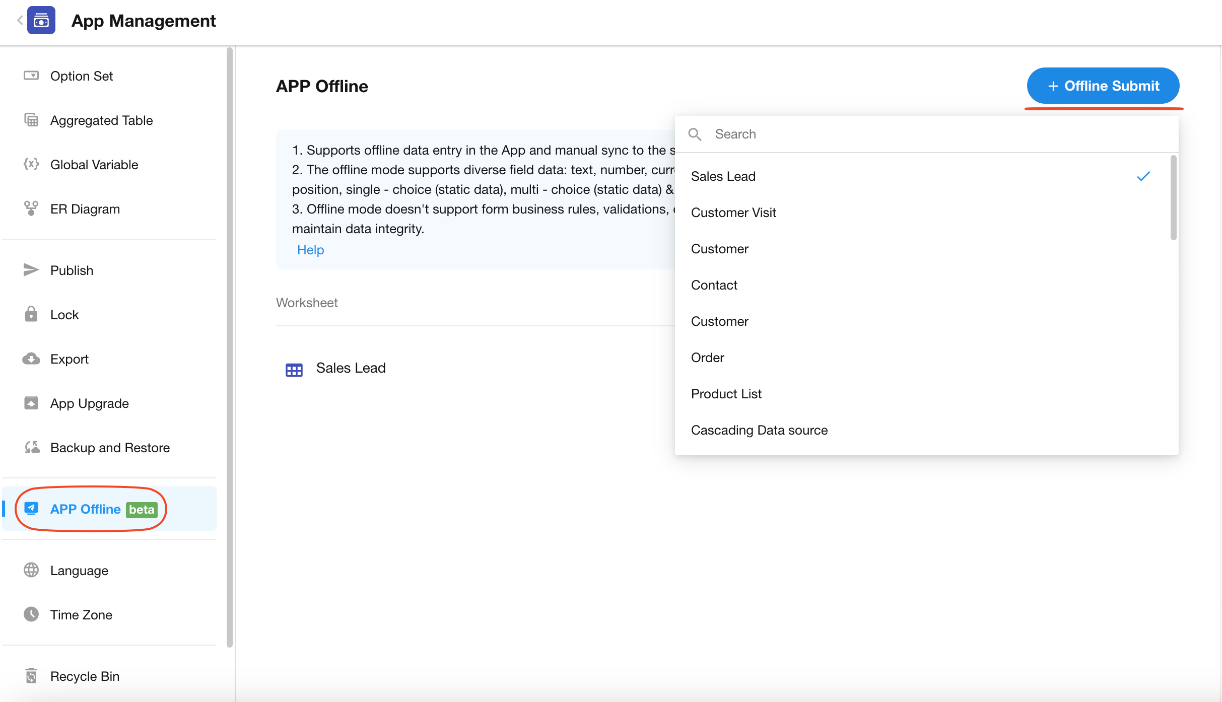 Application administrators go to [App Management] > [APP Offline] and add the worksheets that require offline data entry.