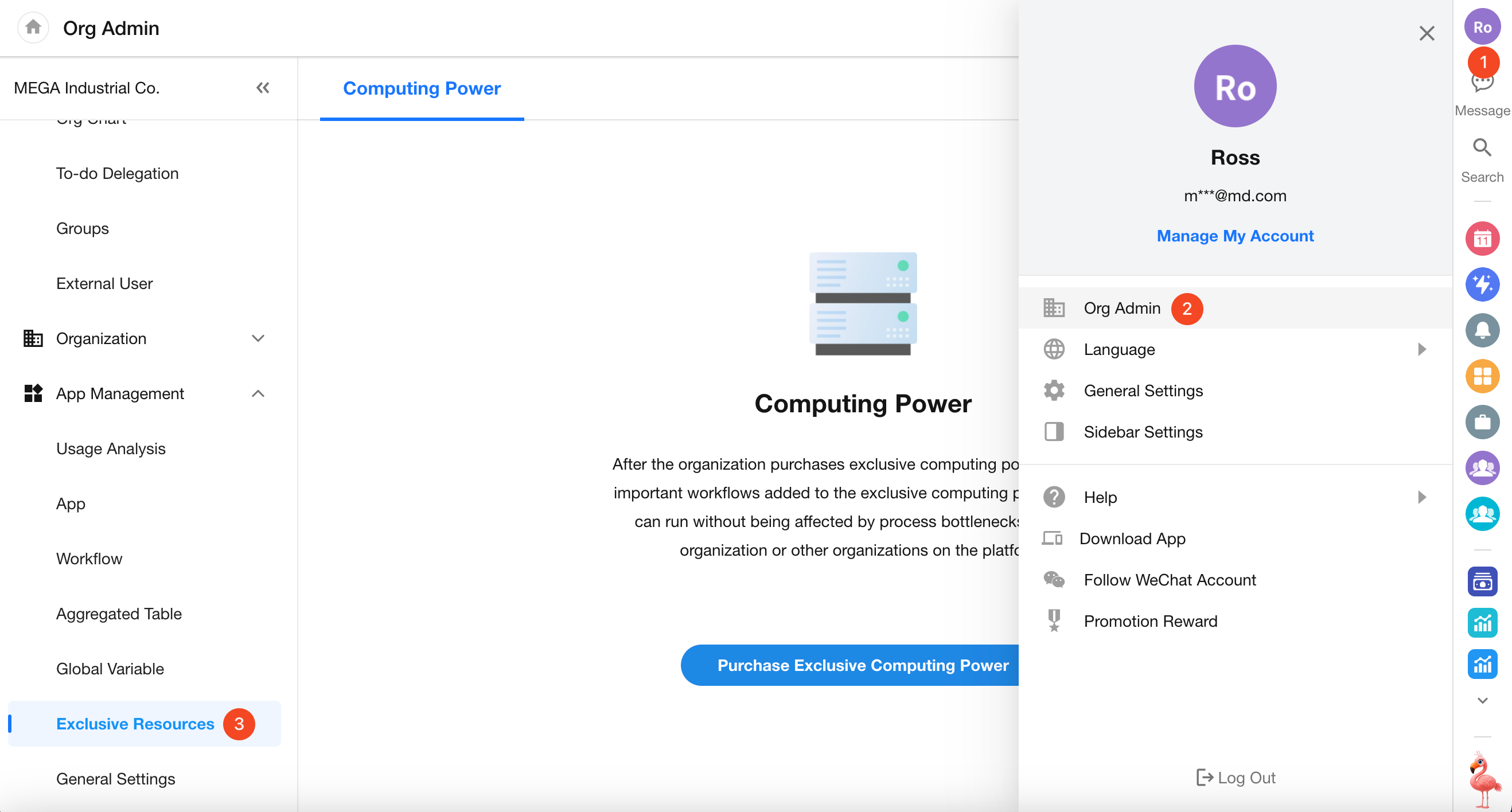 Only super administrators and application administrators of the organization can purchase and manage exclusive computing power on the Organization Management page.