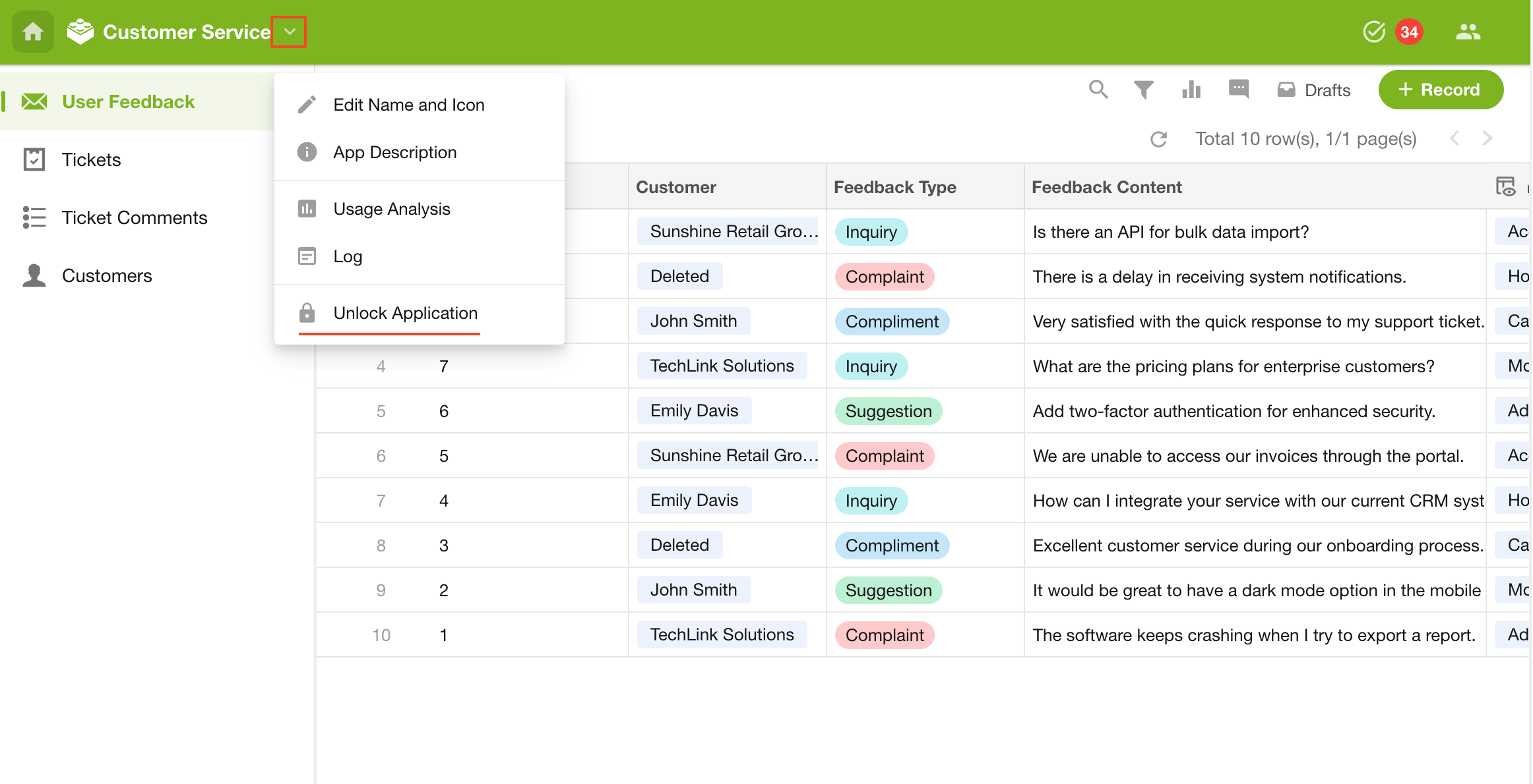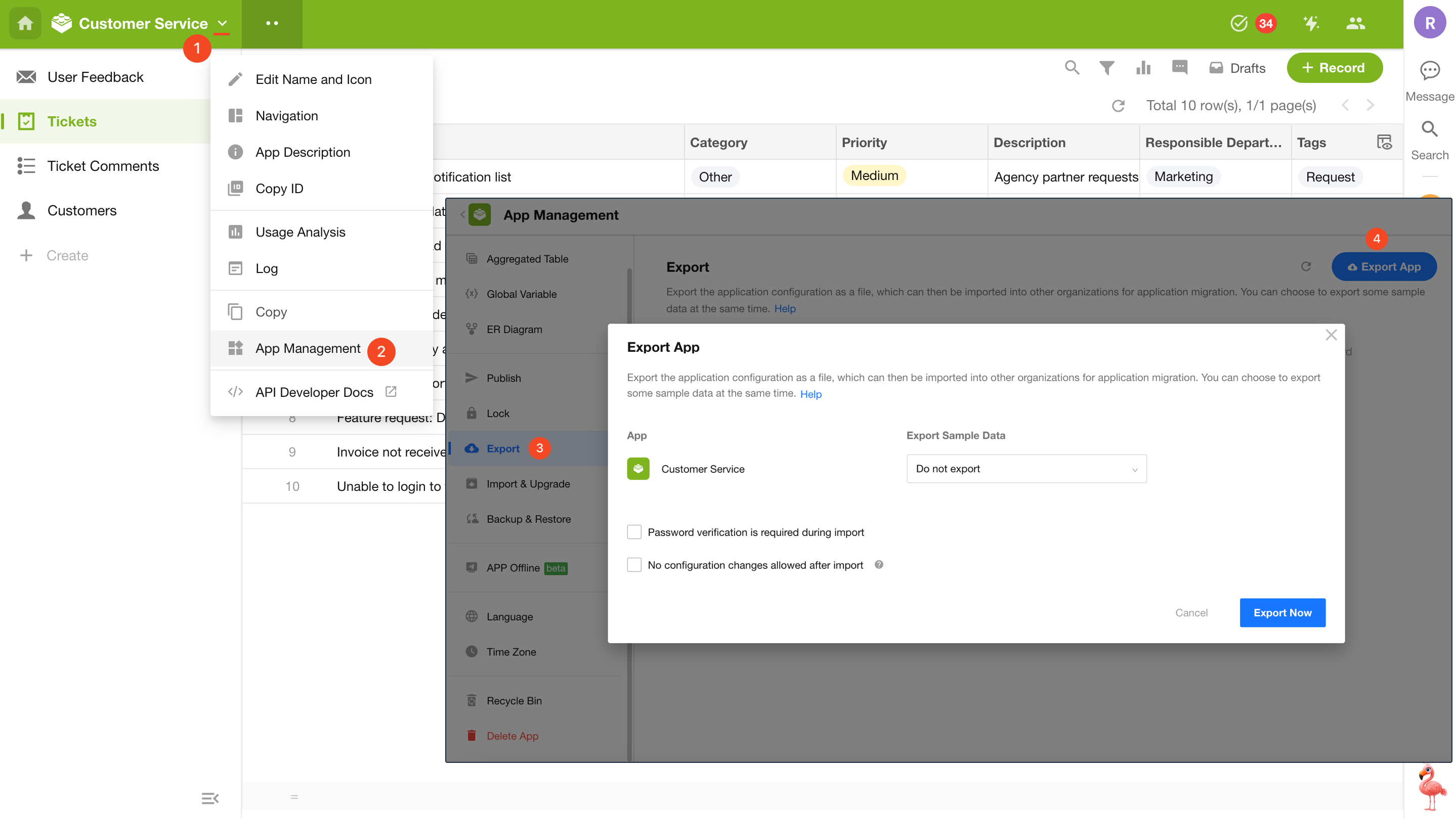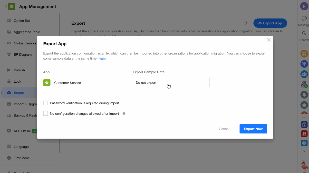 Users can export the entire app configuration and data into a file (mdy format) and import it into another organization to quickly replicate or migrate the app.
