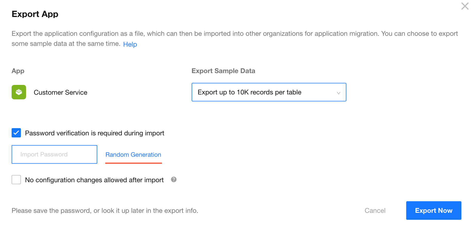 The password can be generated automatically or set manually. If forgotten, it can be viewed in the export record list.