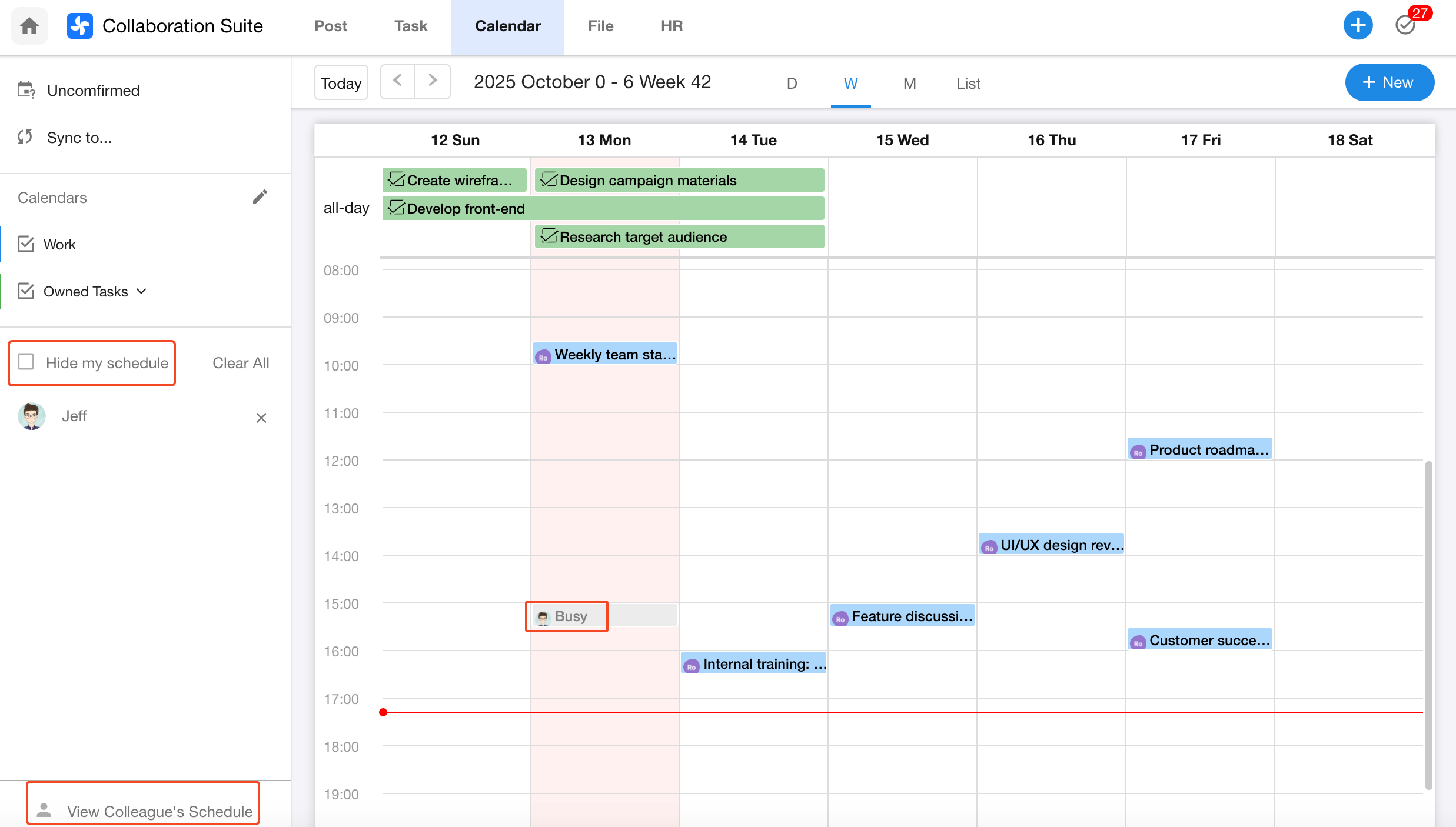 You can click “View Colleagues’ Schedule” at the bottom left corner to check other users' schedules.