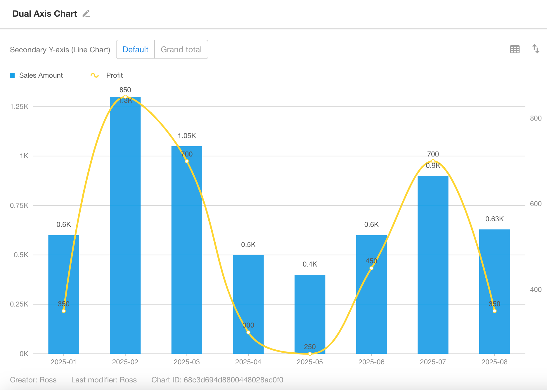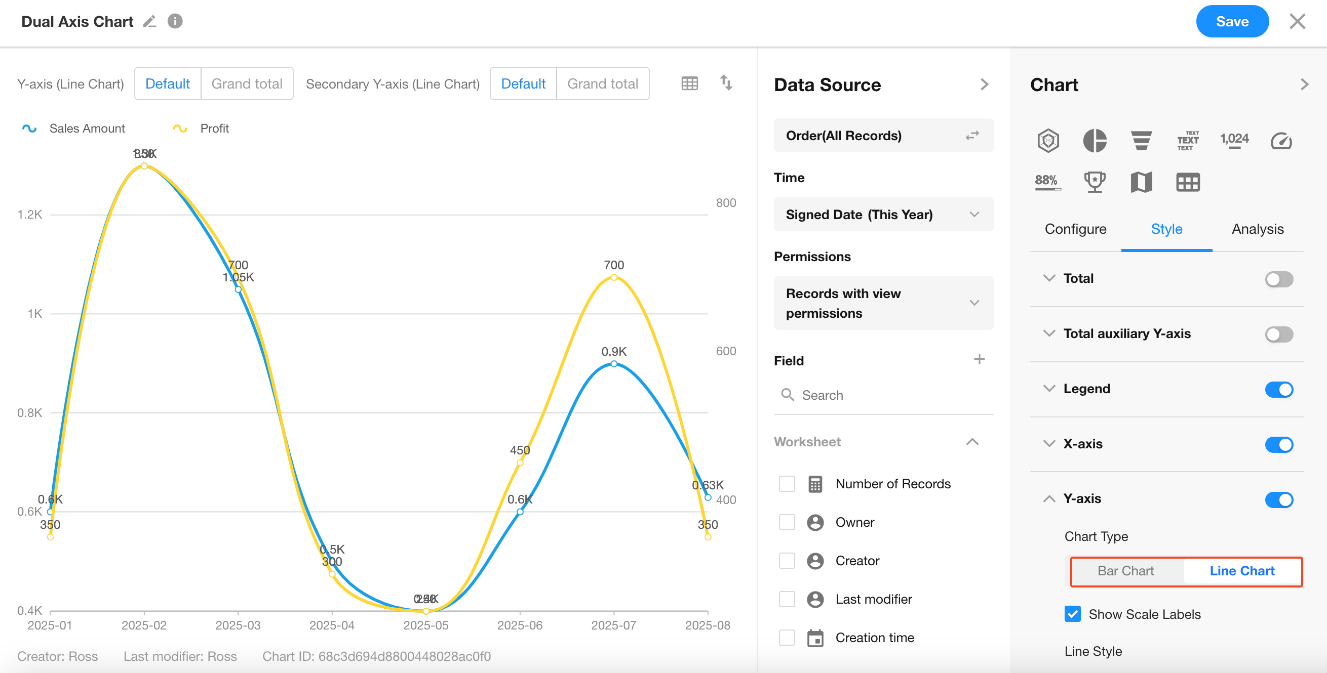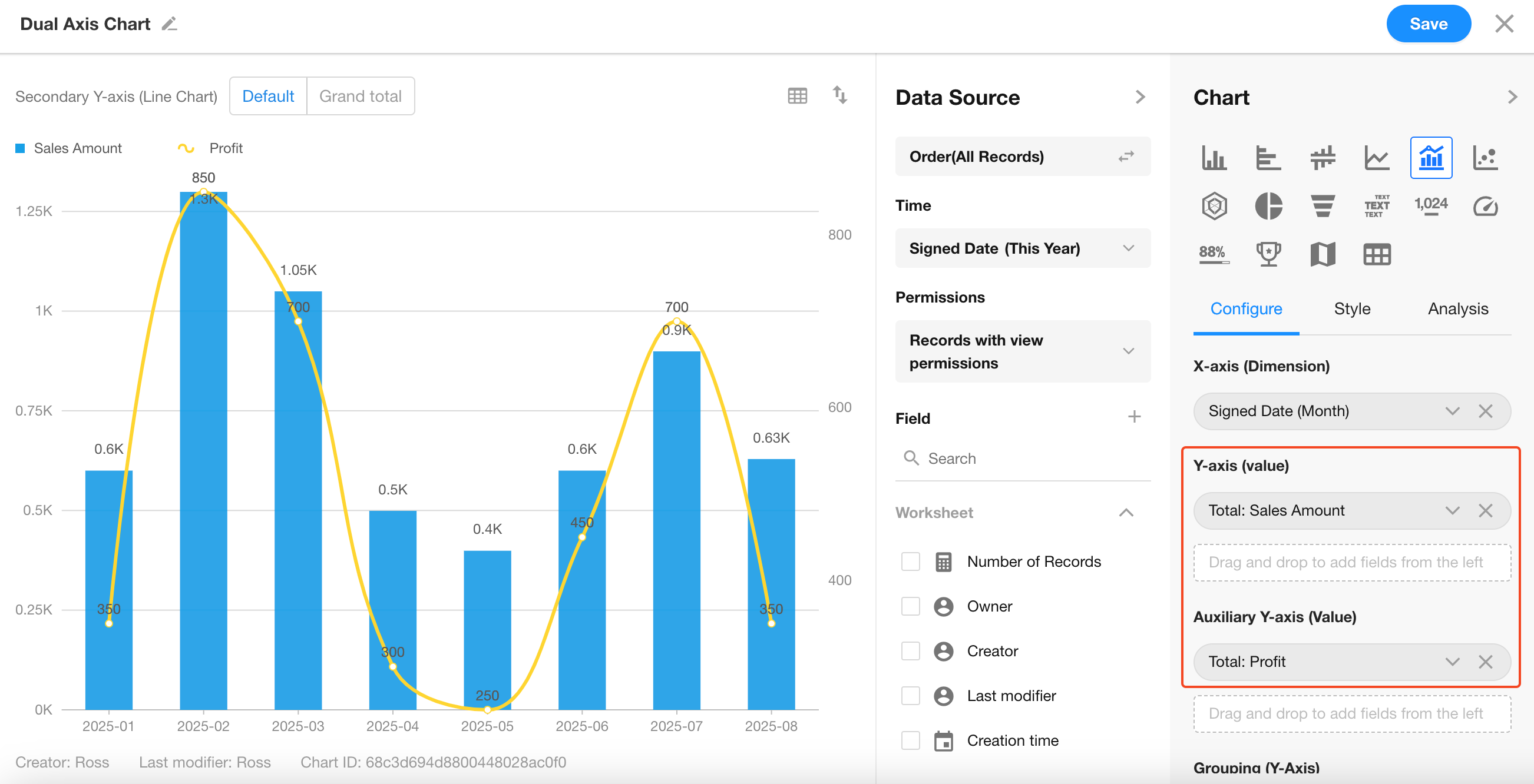 By default, the left Y-axis uses bar charts, and the right Y-axis uses line charts.
