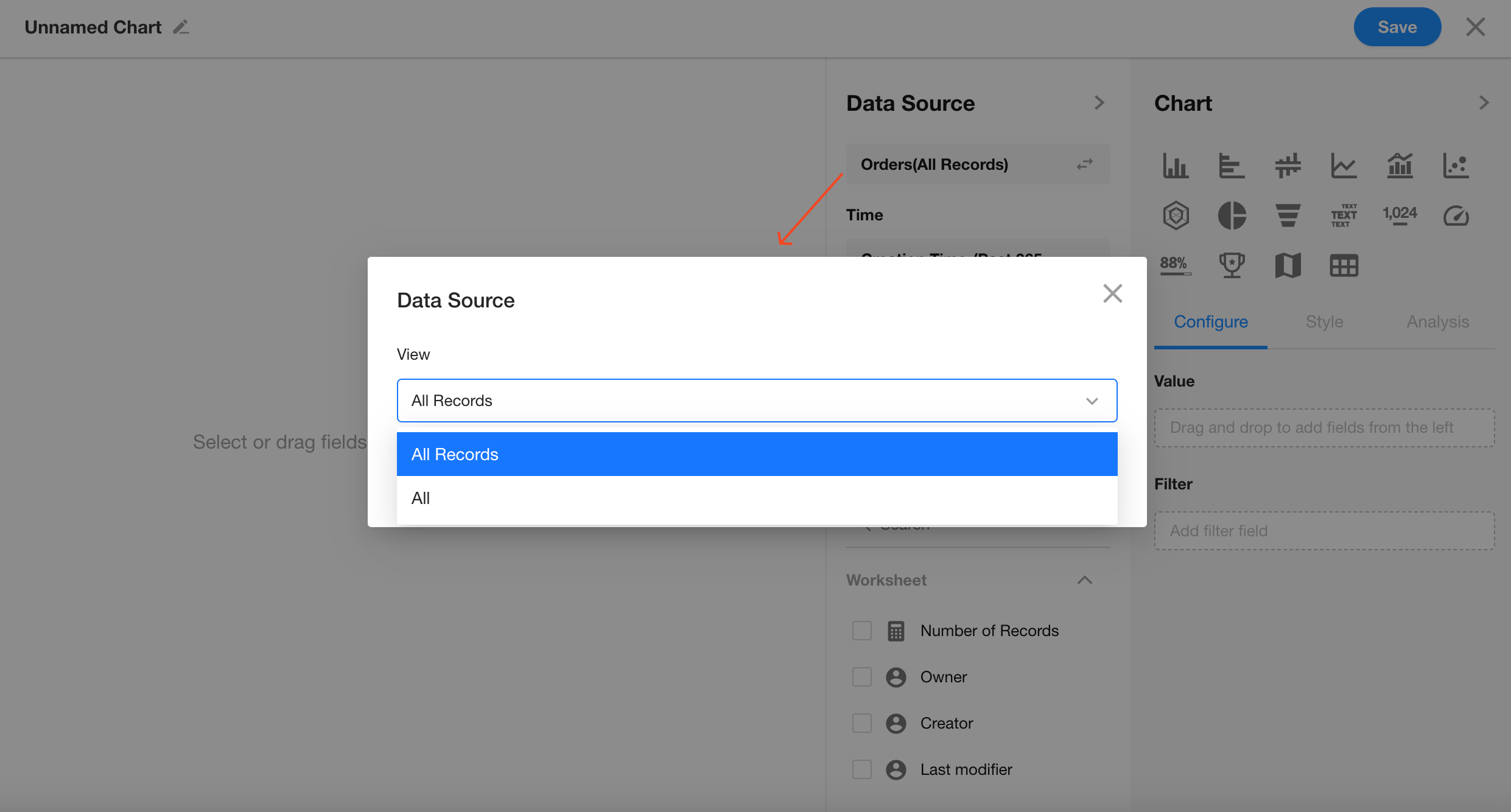 You can choose to analyze all records or only those in a specific view (defaults to all records).