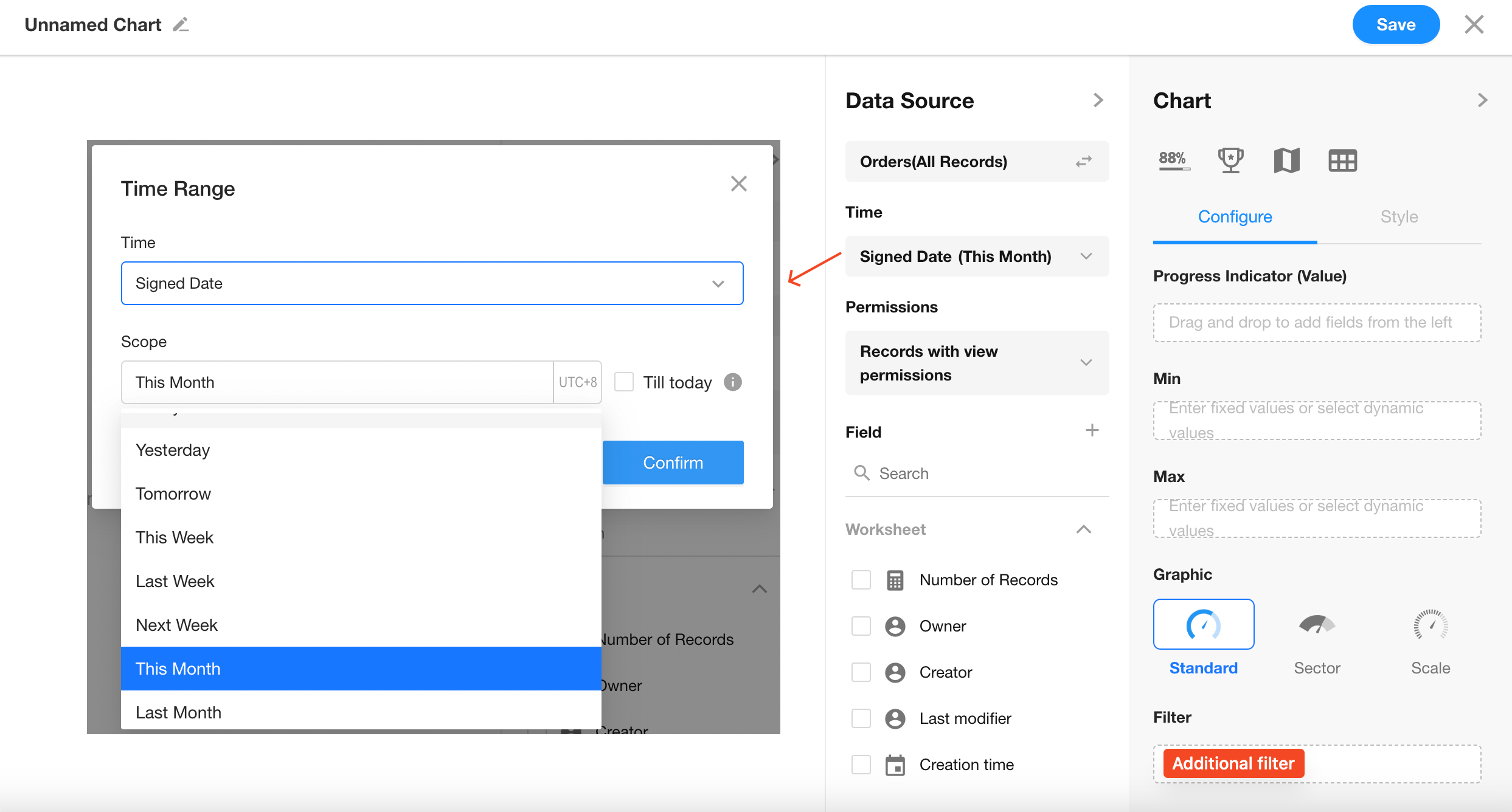 Data Scope: Filter records in the "Orders" worksheet where "Signed Date" is within the current month
