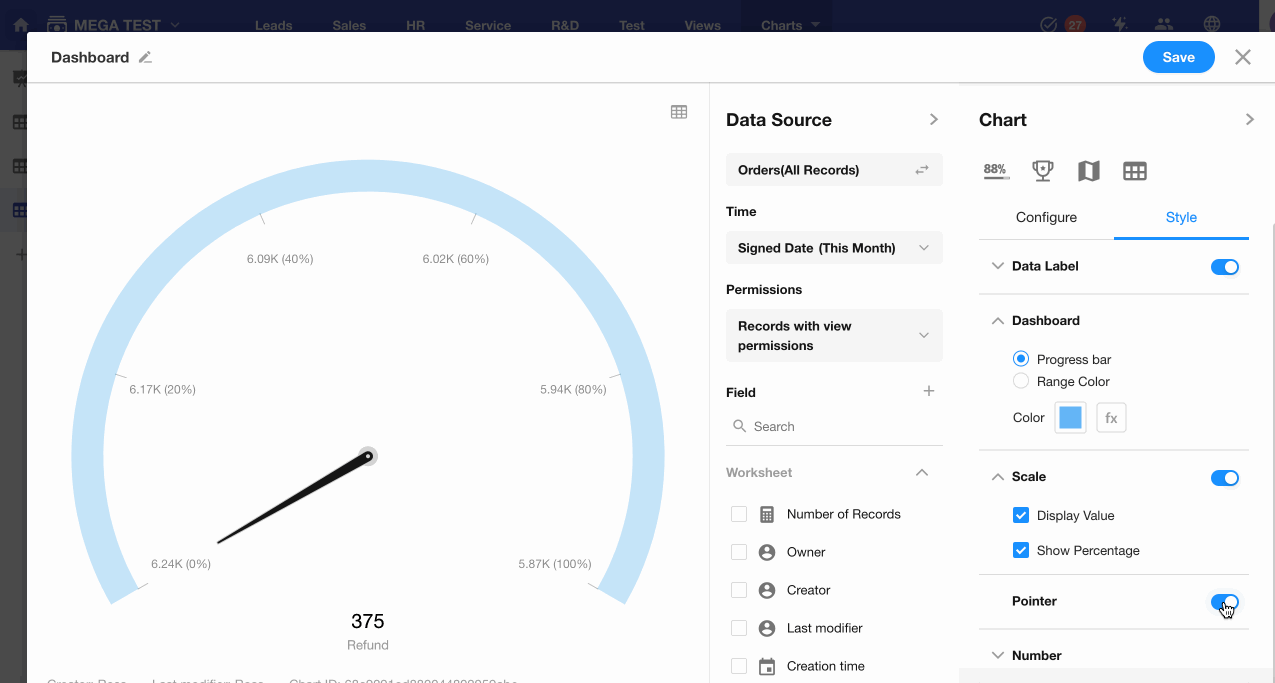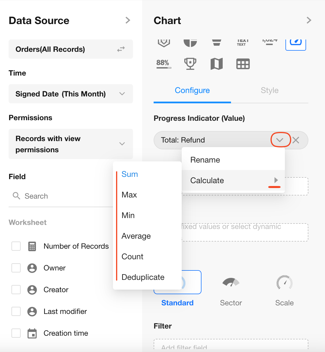 Example: Create a dashboard in the Orders worksheet to monitor the refund amount for product sales this month