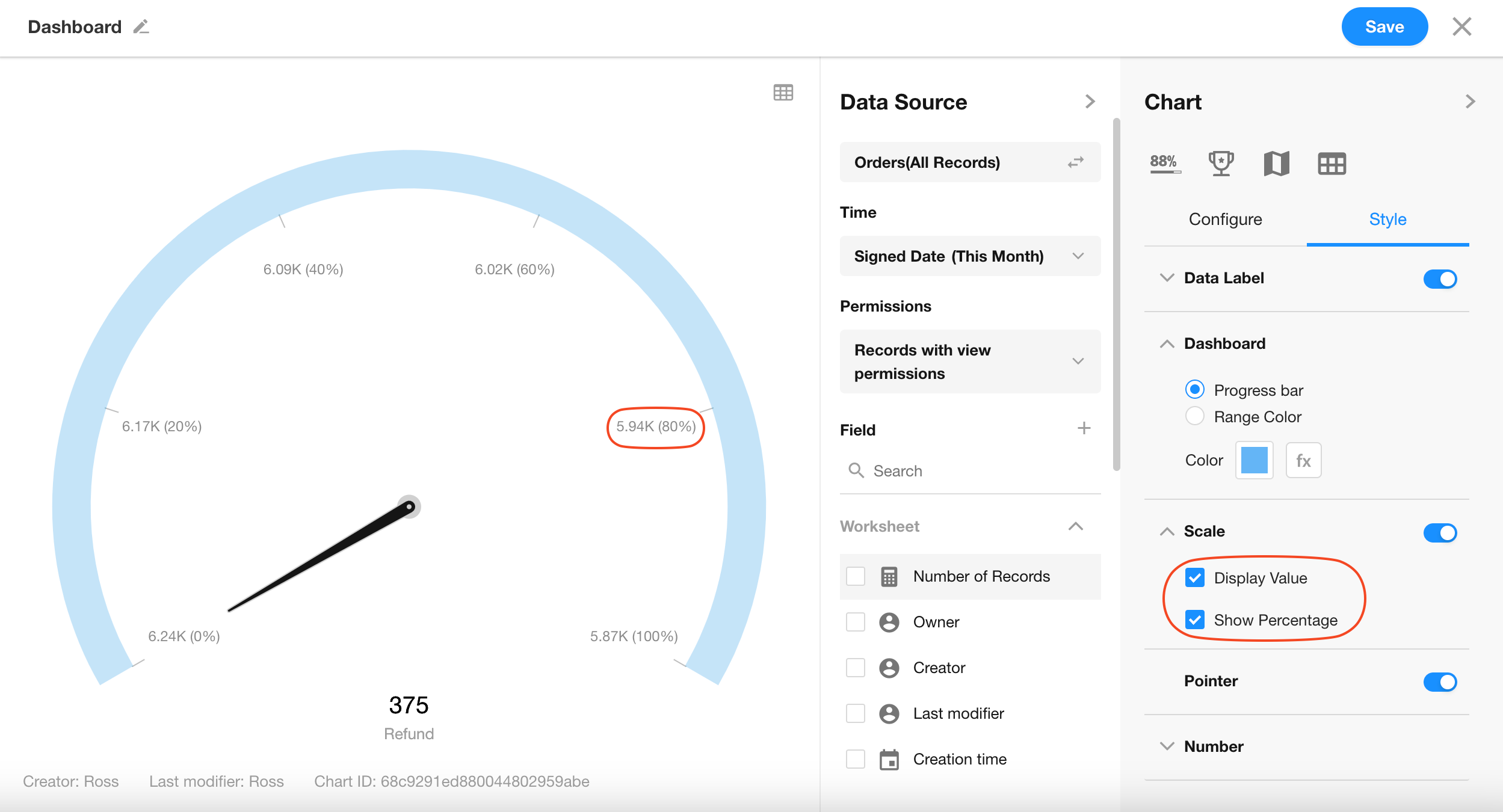 Configure how values are shown on the chart—either as raw numbers, percentage format, or hidden.