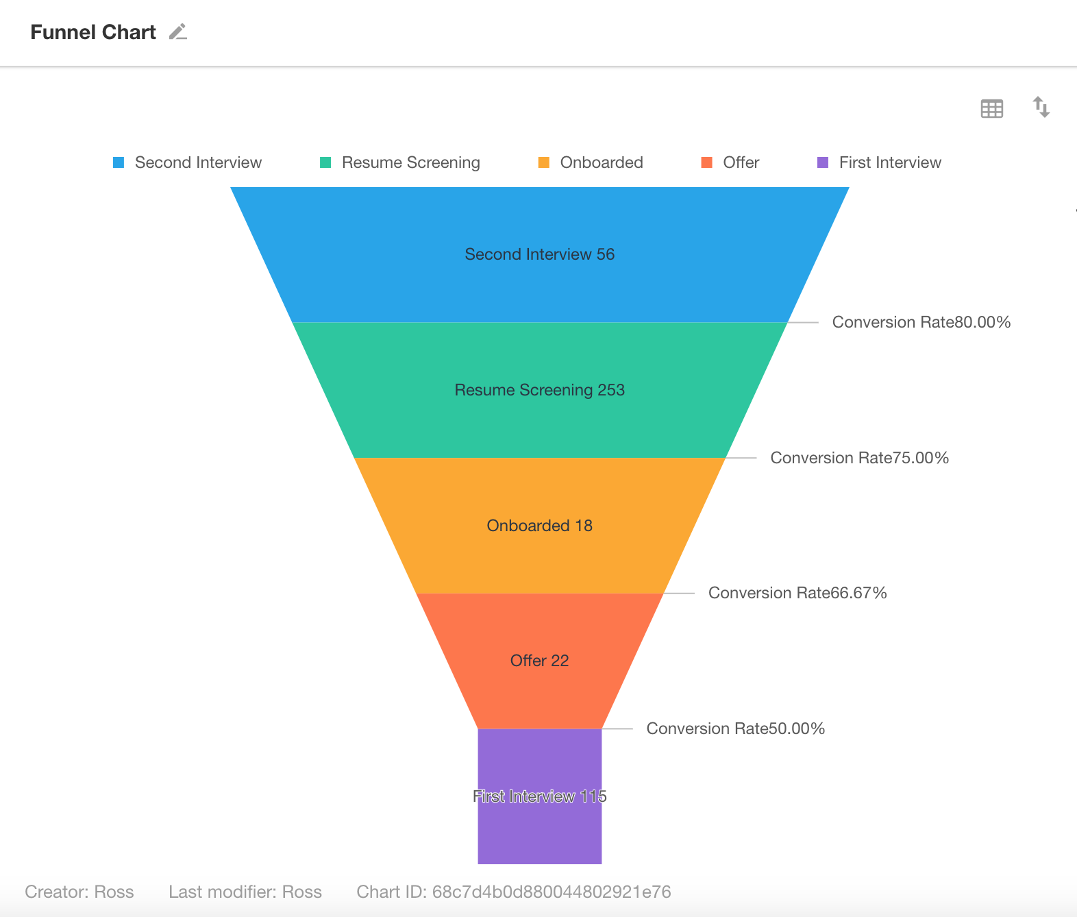 A funnel chart consists of a series of trapezoids stacked from top to bottom. Each section represents a stage in a sequential process, with the size of each section indicating the volume difference from the previous stage. Funnel charts are ideal for visualizing drop-offs in business processes such as recruitment, sales pipelines, or approval flows.