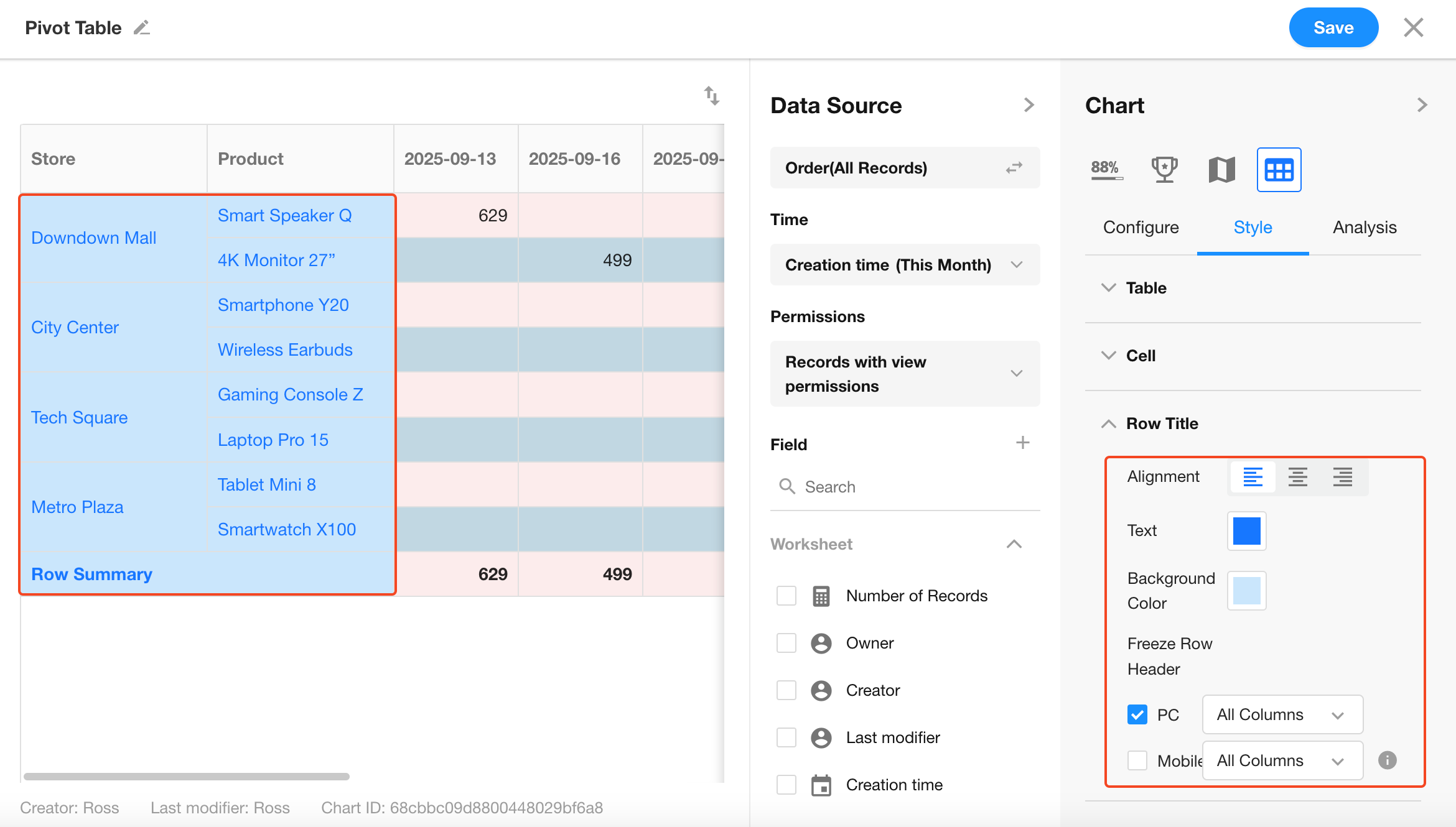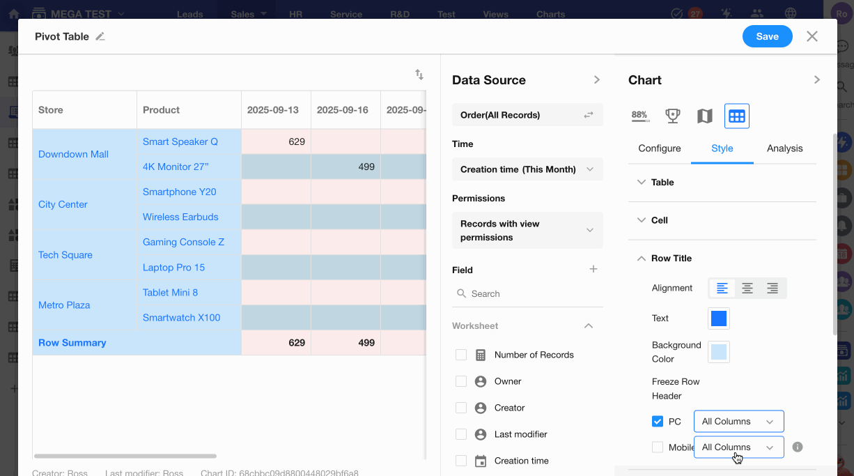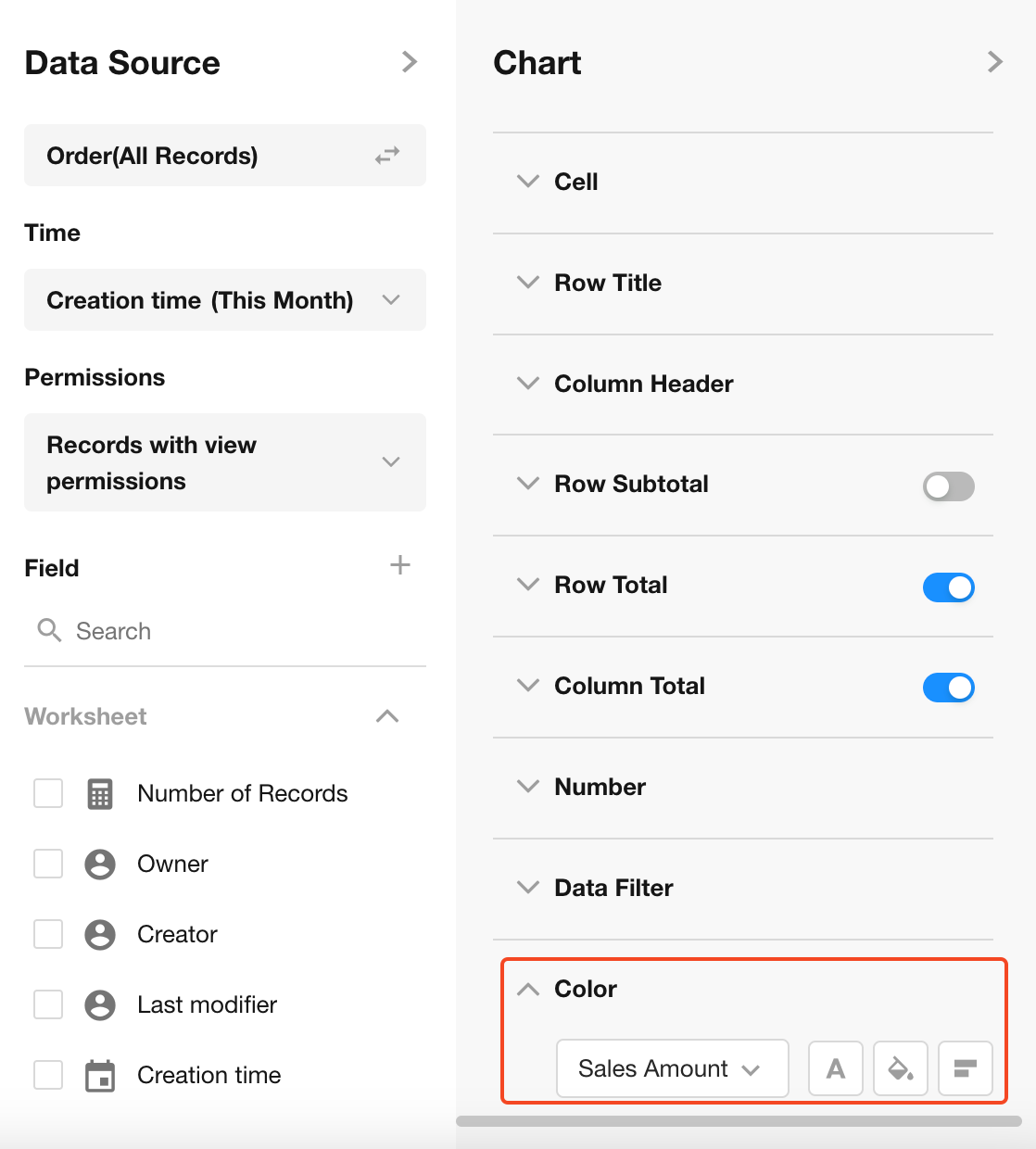 Configure cell background color, font color, and display style within the pivot table.
