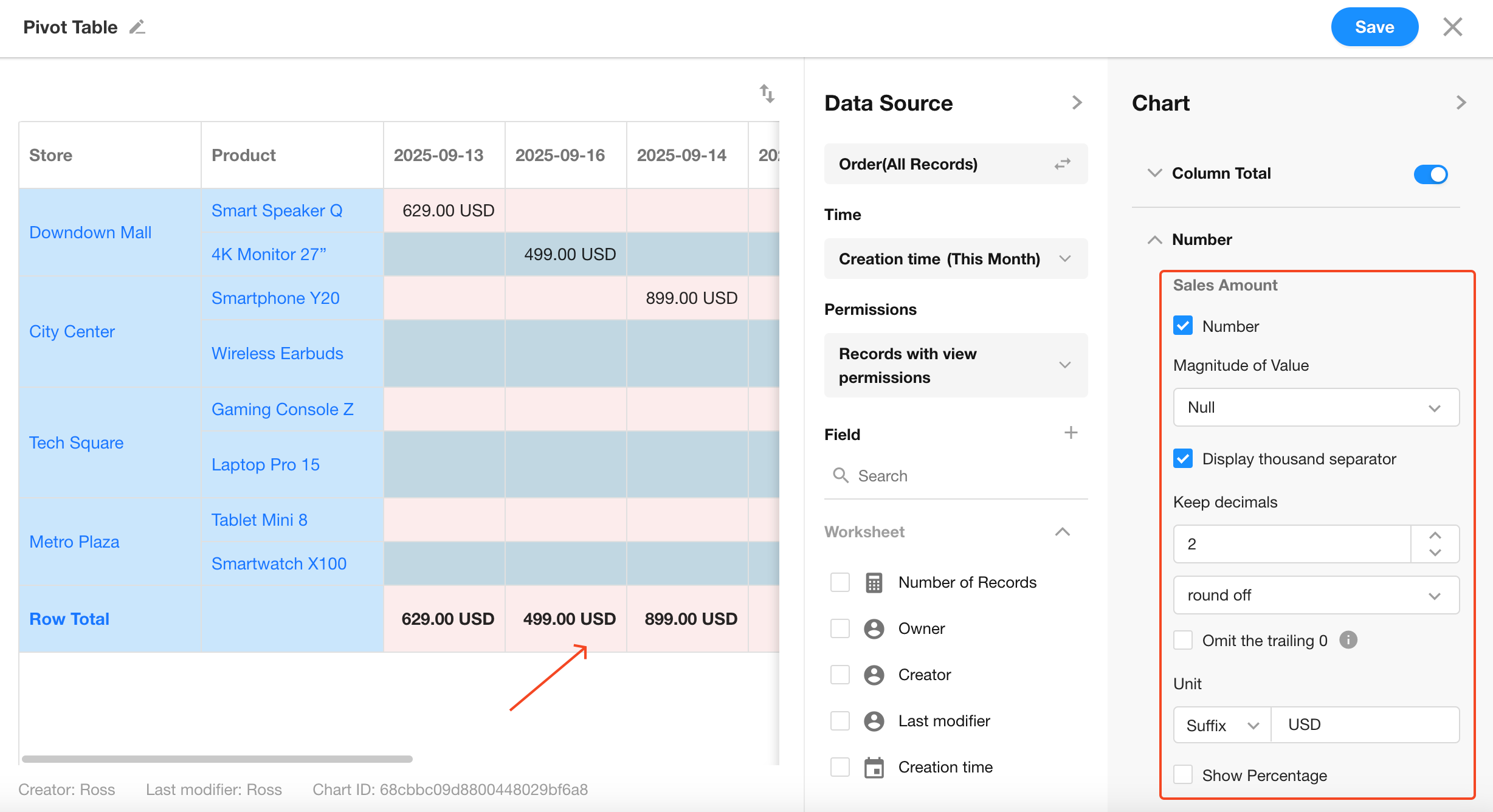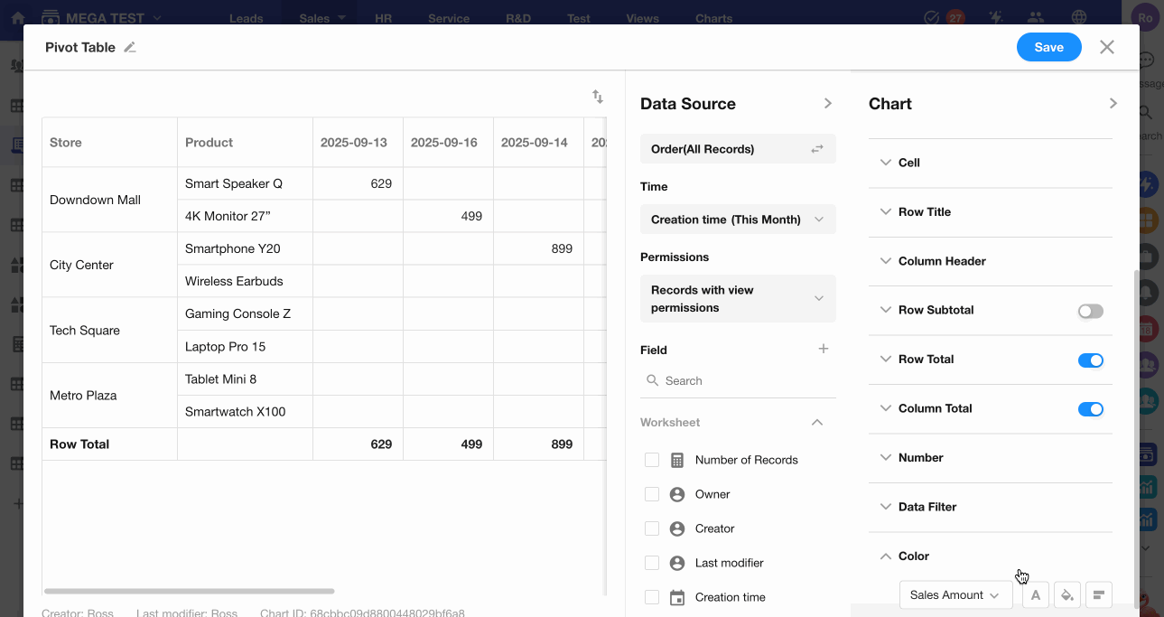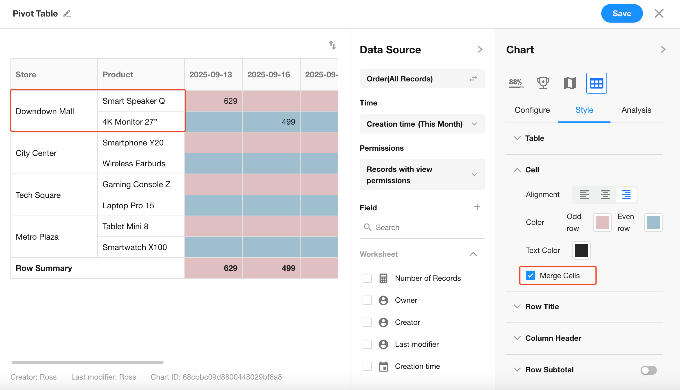 Configure cell background color, font color, and display style within the pivot table.