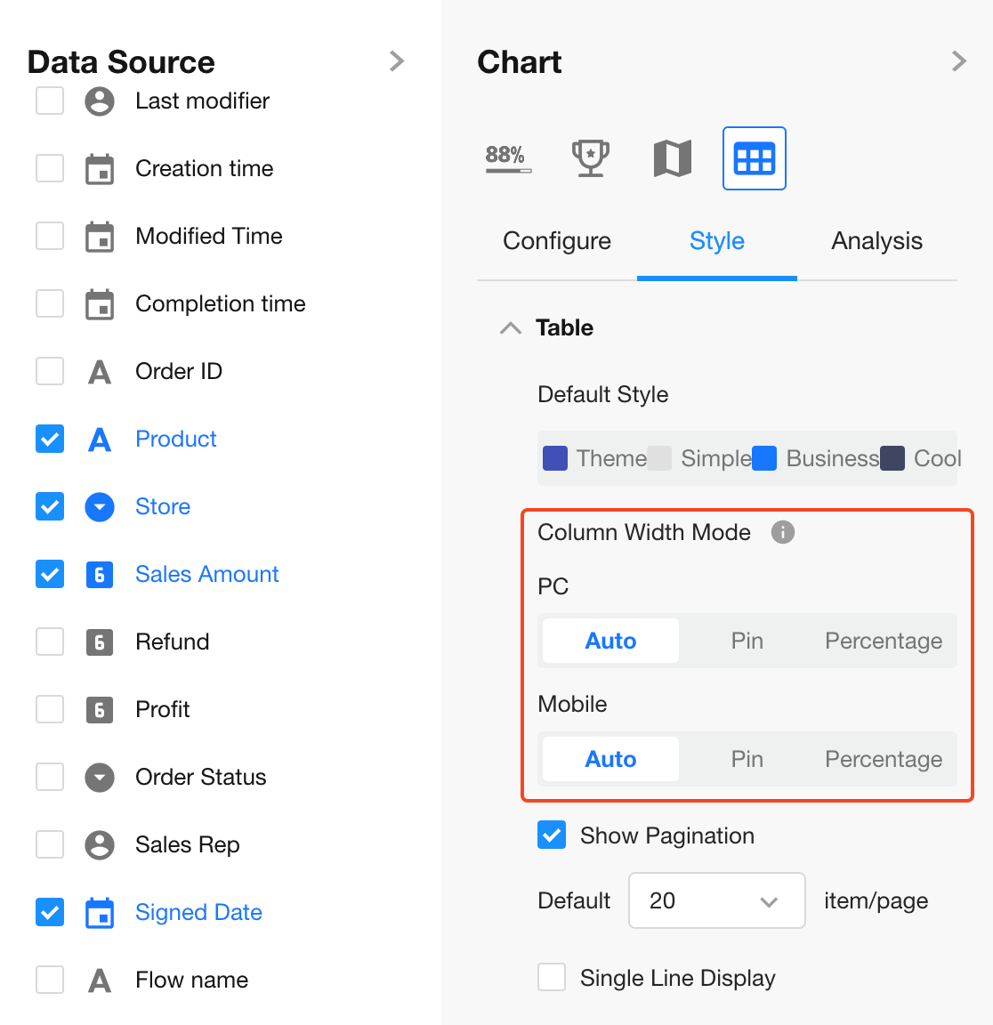 On mobile, only Fixed and Percentage modes are supported. Default is Fixed Width.