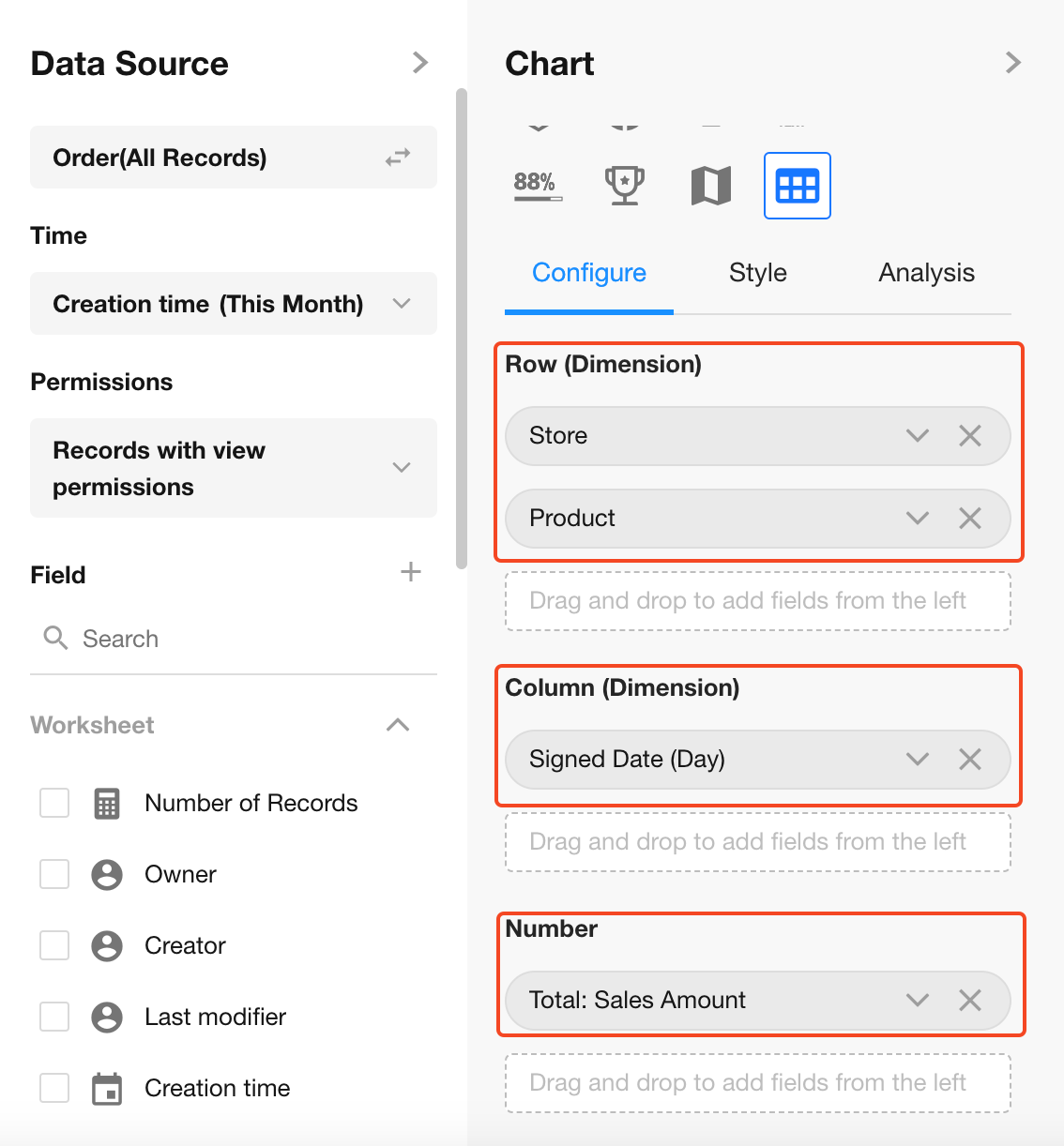 If a selected dimension field is from a related record, you can configure display fields of the related worksheet.