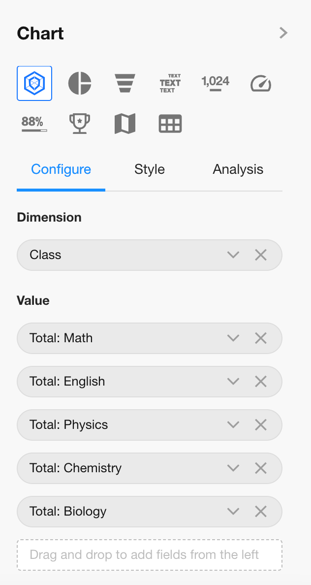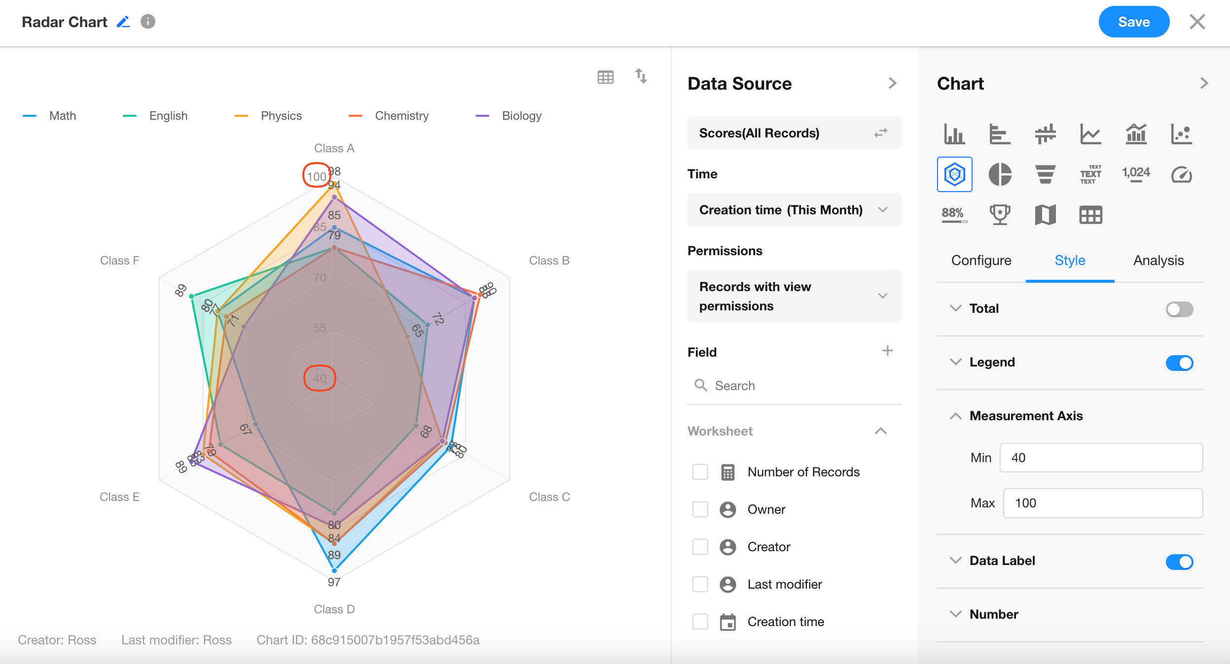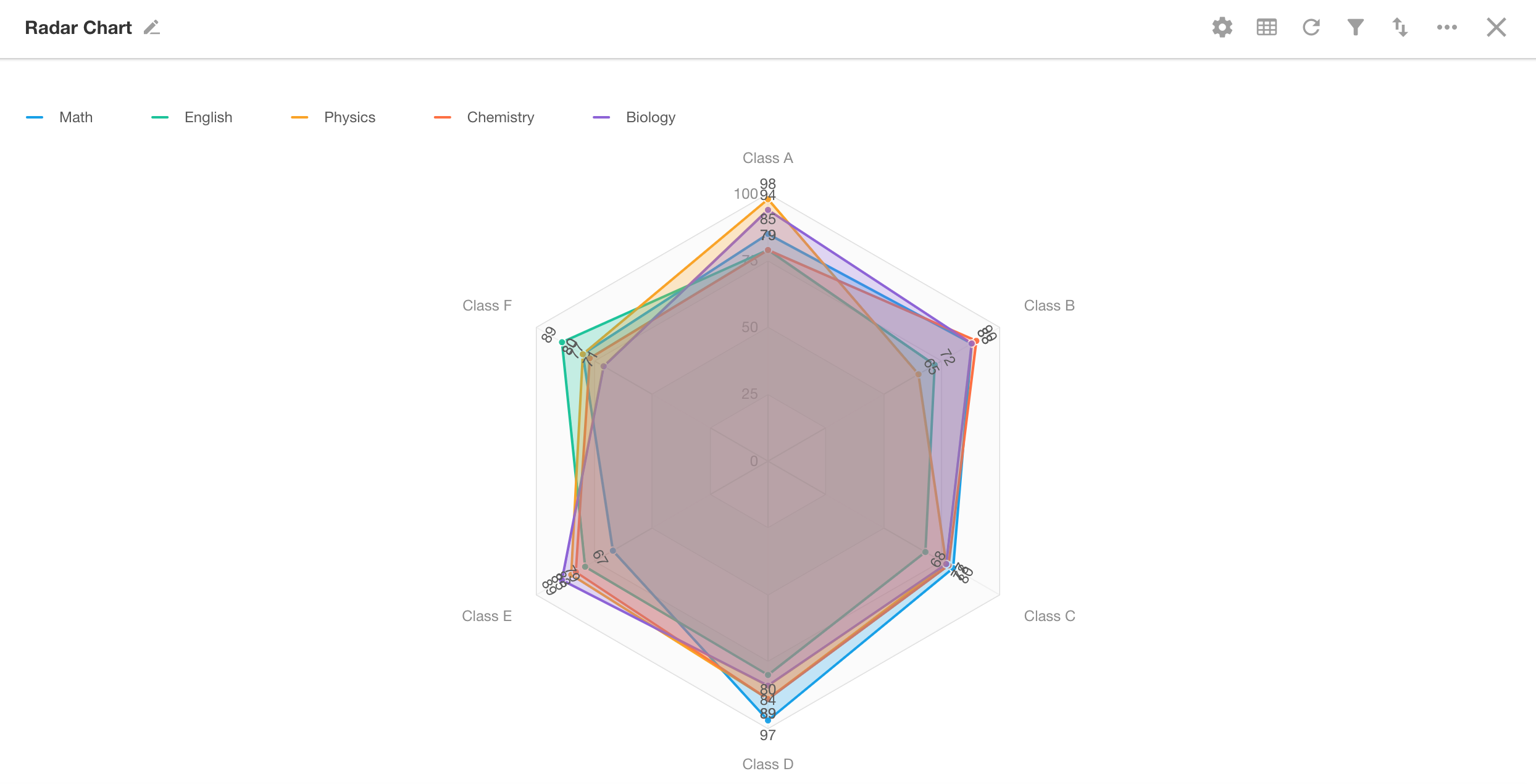 Example: Create a radar chart to compare the average scores of five subjects across six classes