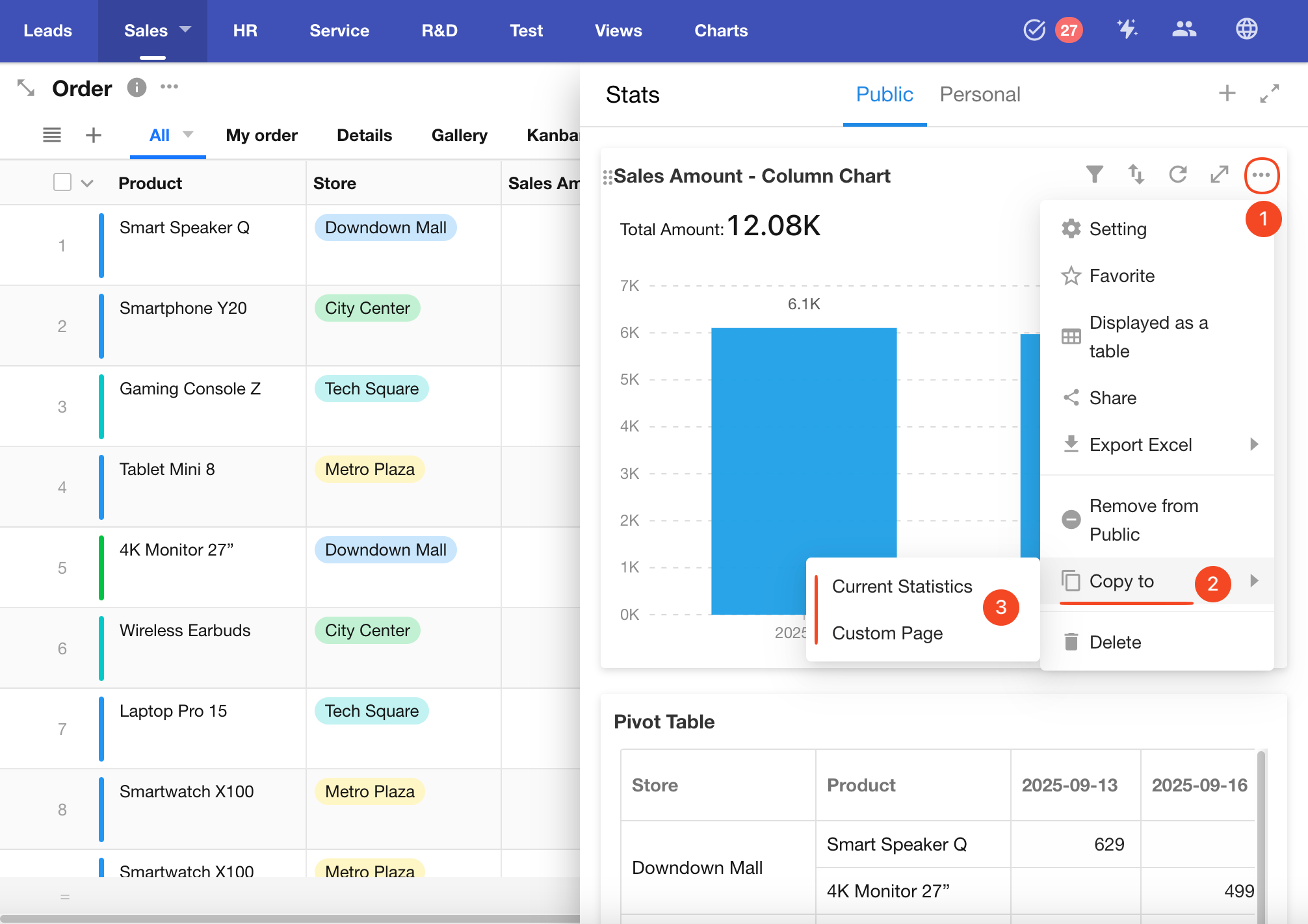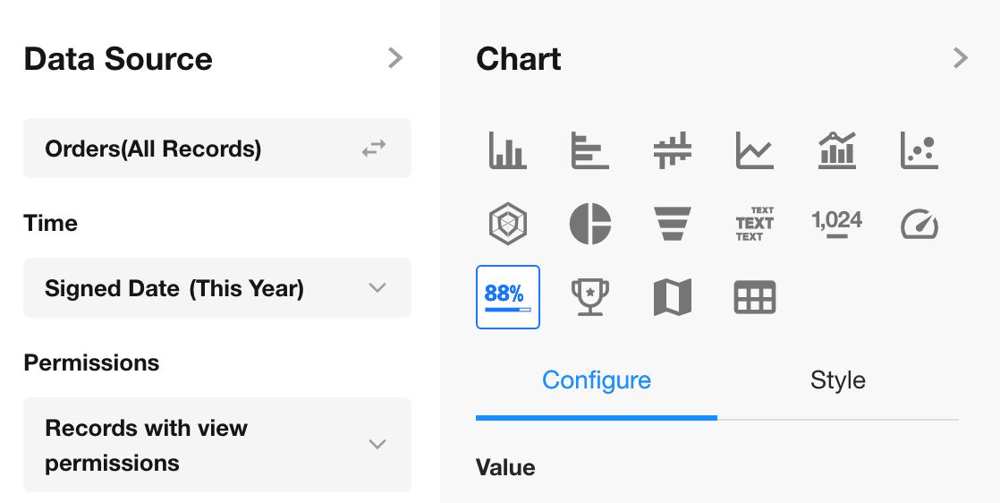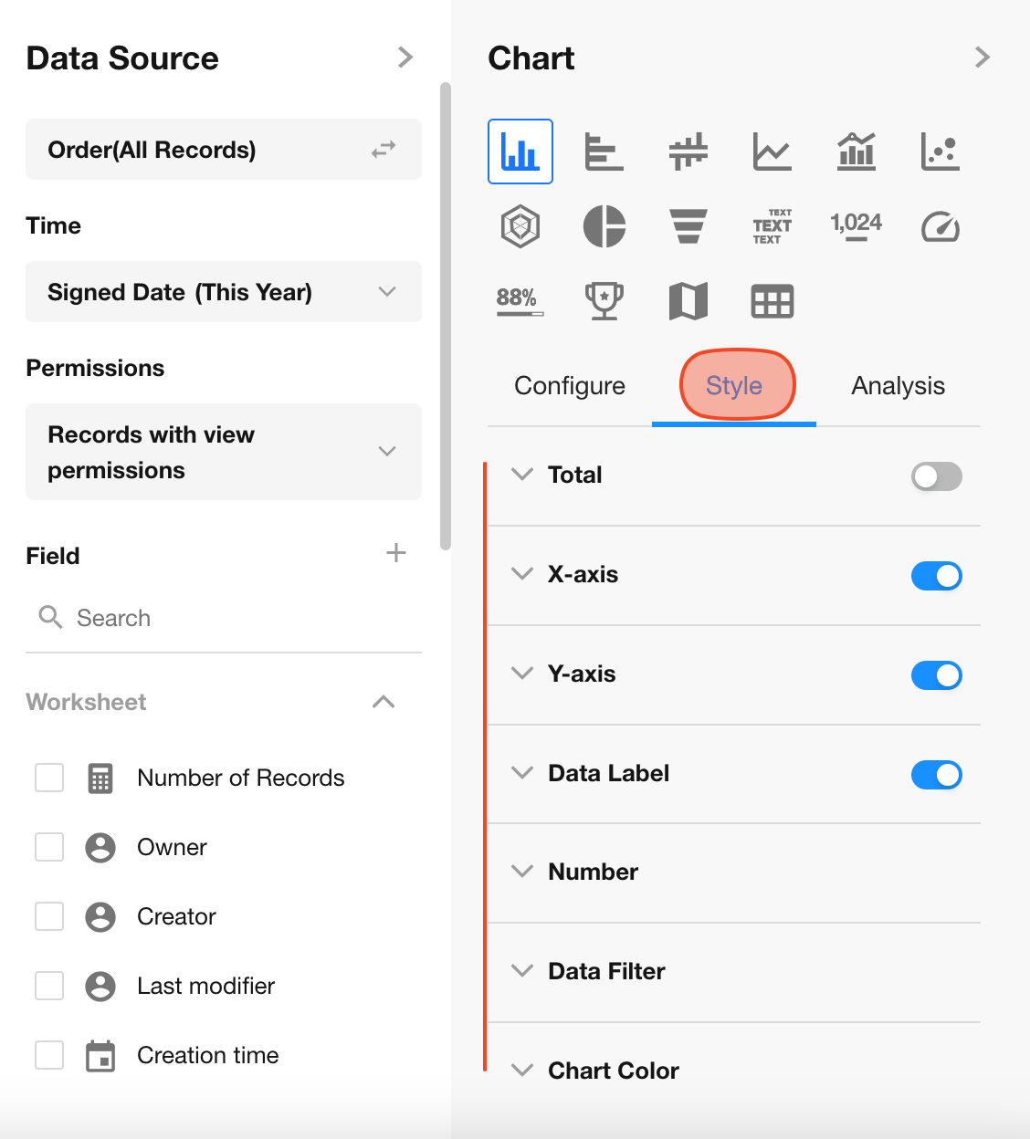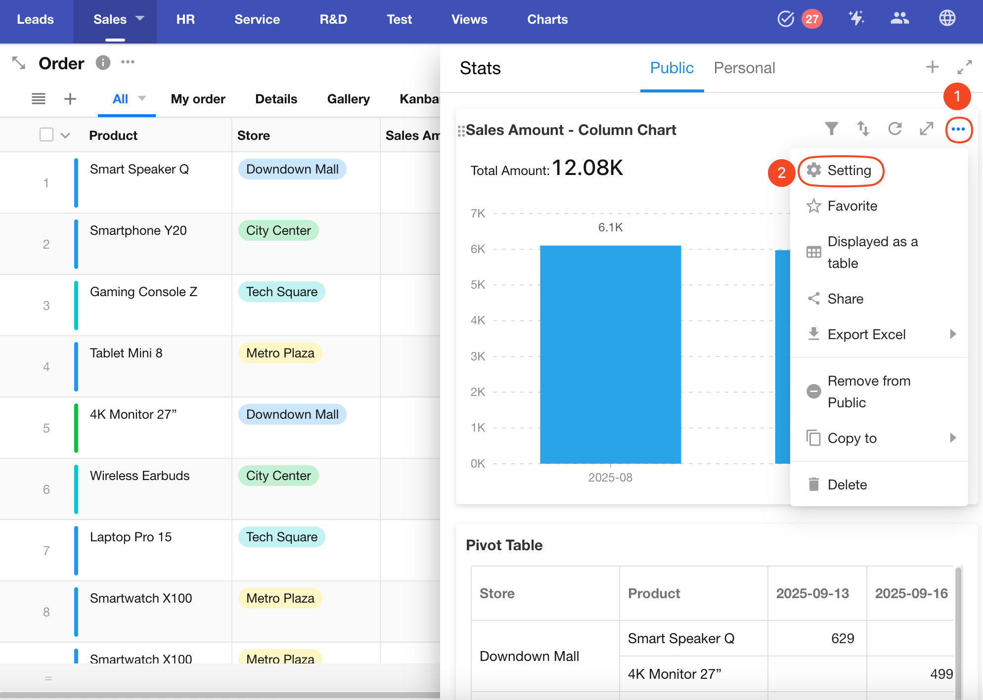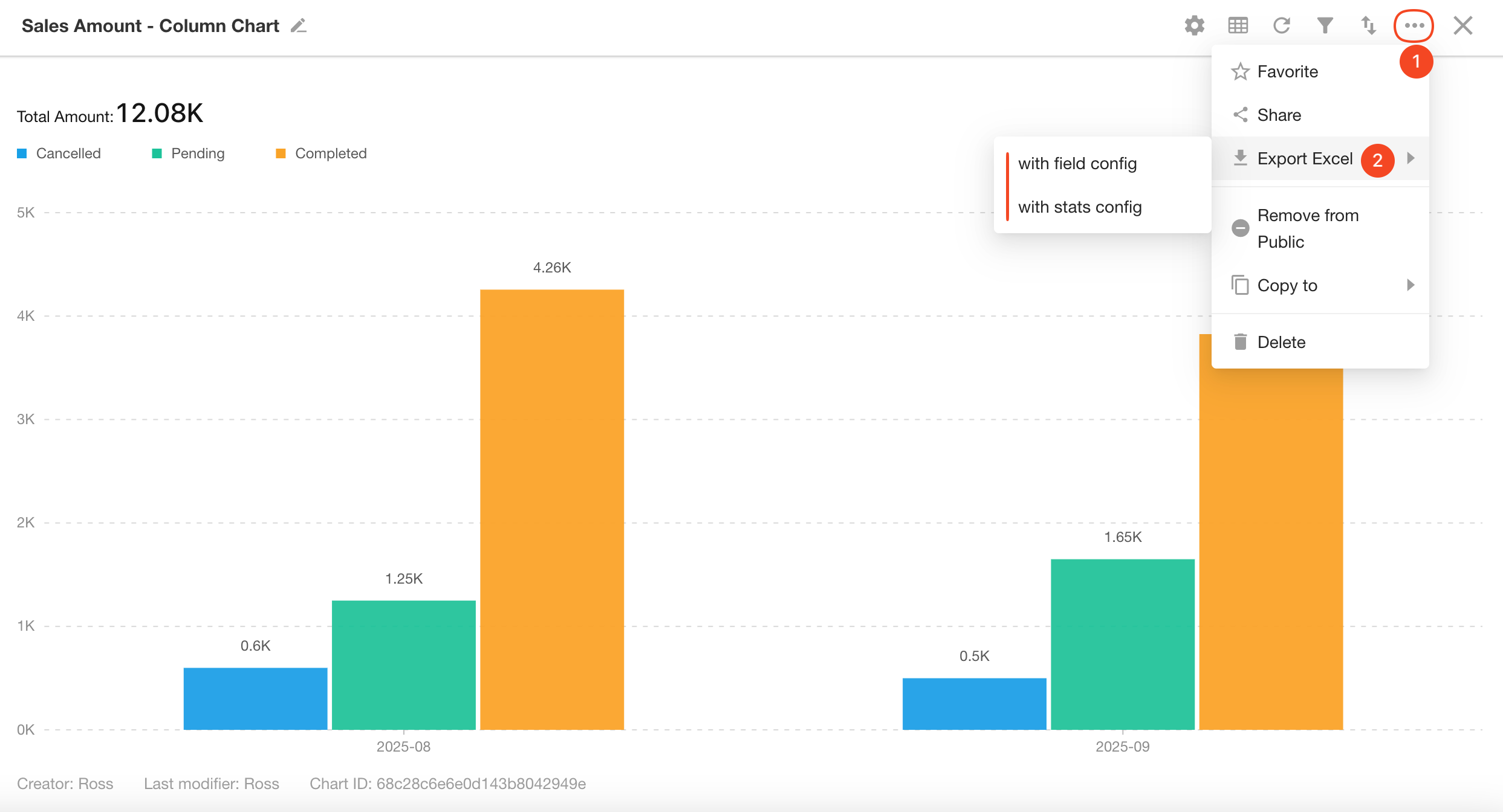 To modify an existing chart, click the “...” menu, then select Settings to re-enter the configuration panel. The settings interface is identical to the initial chart creation.