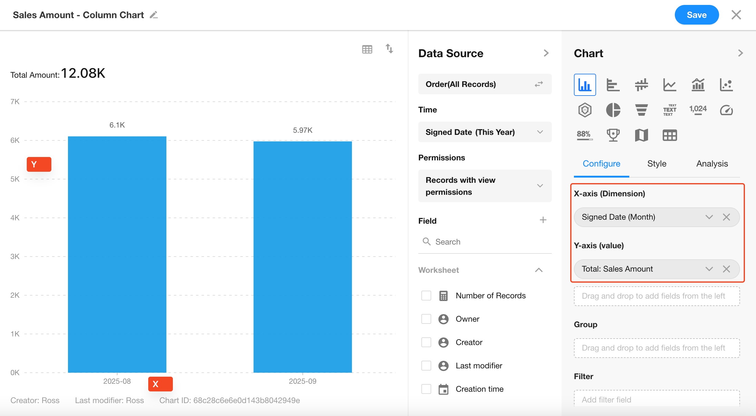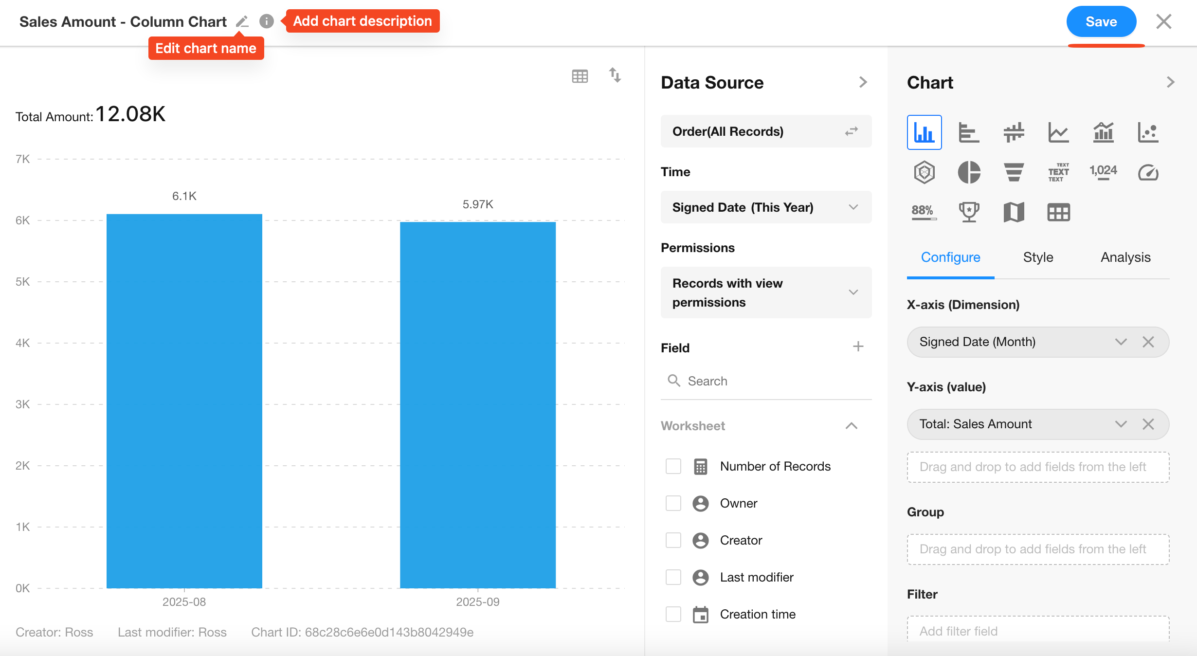 Click the icon in the top-left corner of the chart to set its name and description. Then click Save to complete the configuration.