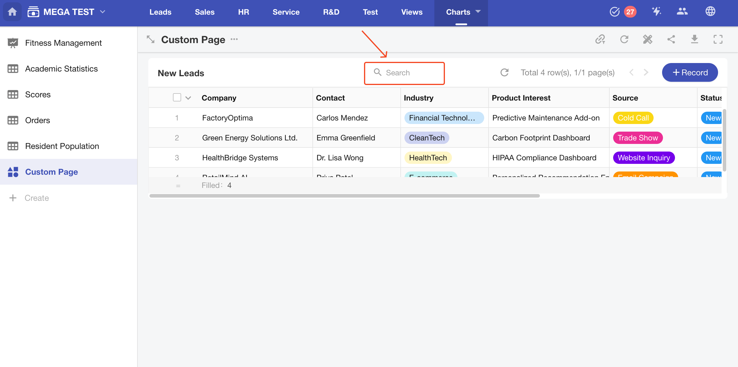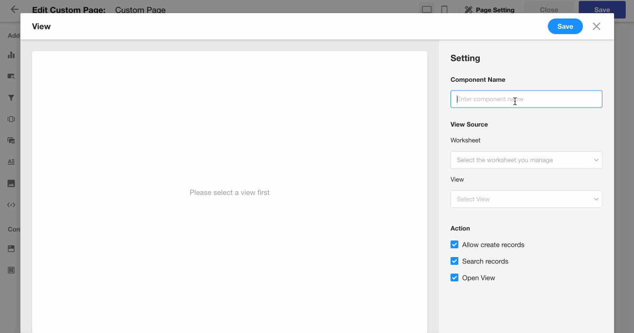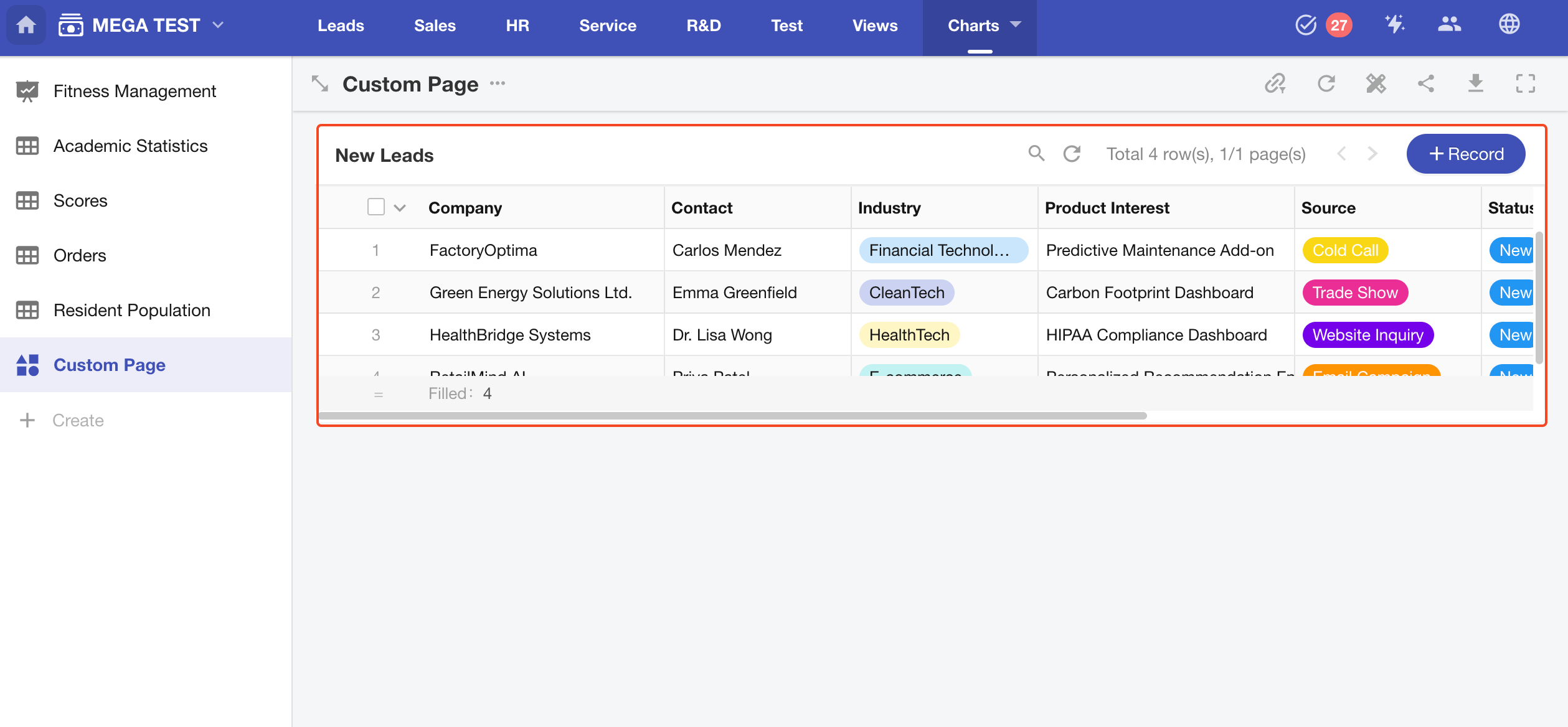 Example: Embed the “New Leads” view from the Sales Leads worksheet into the custom page to help sales reps assign and follow up efficiently.