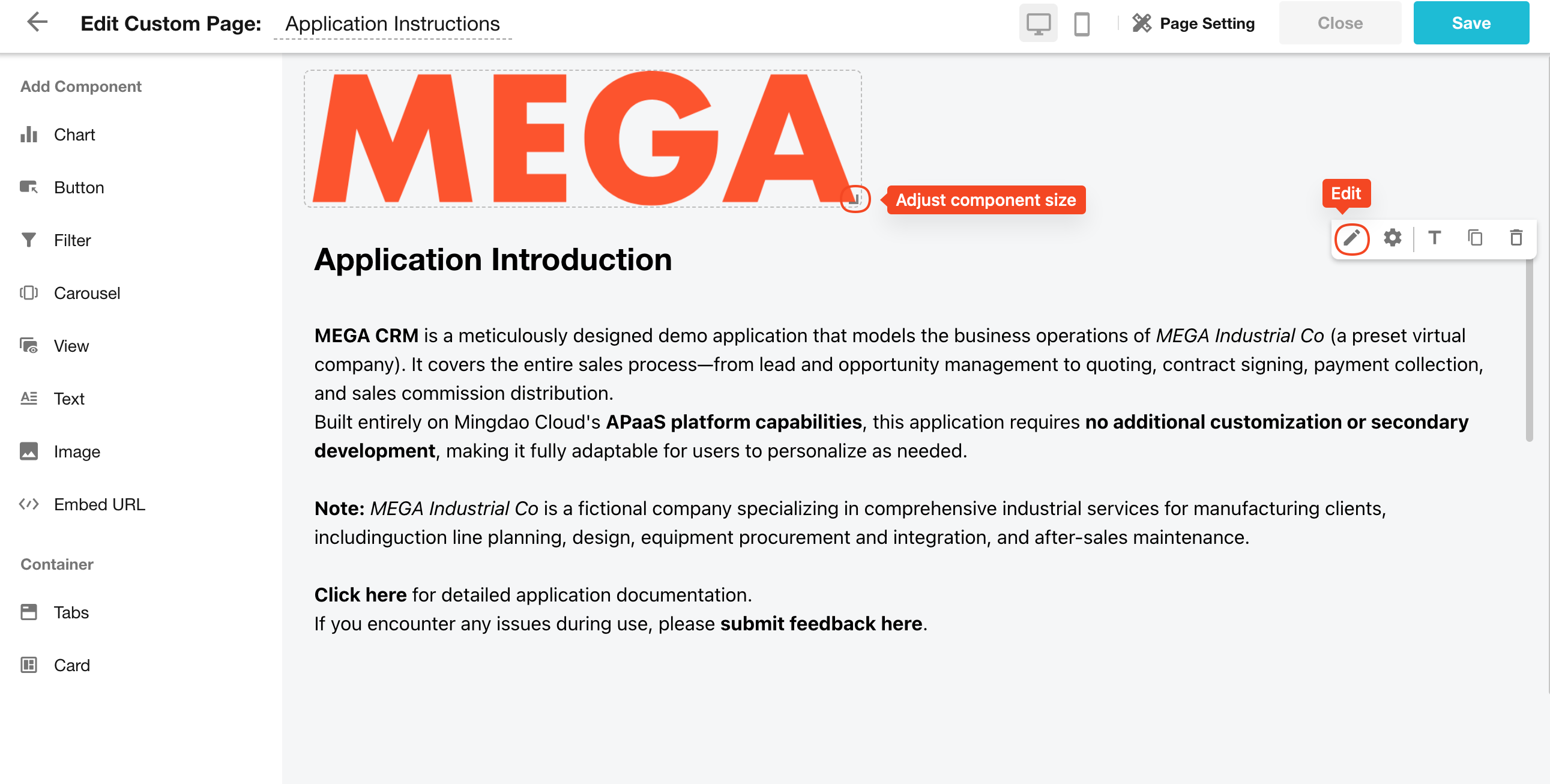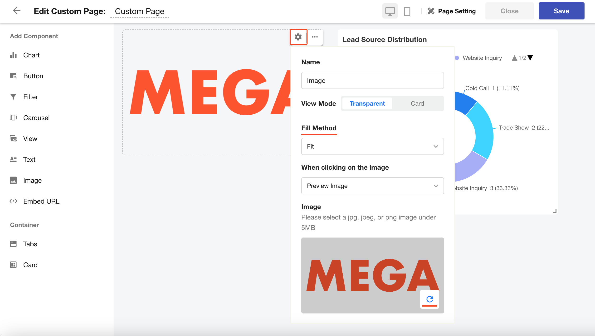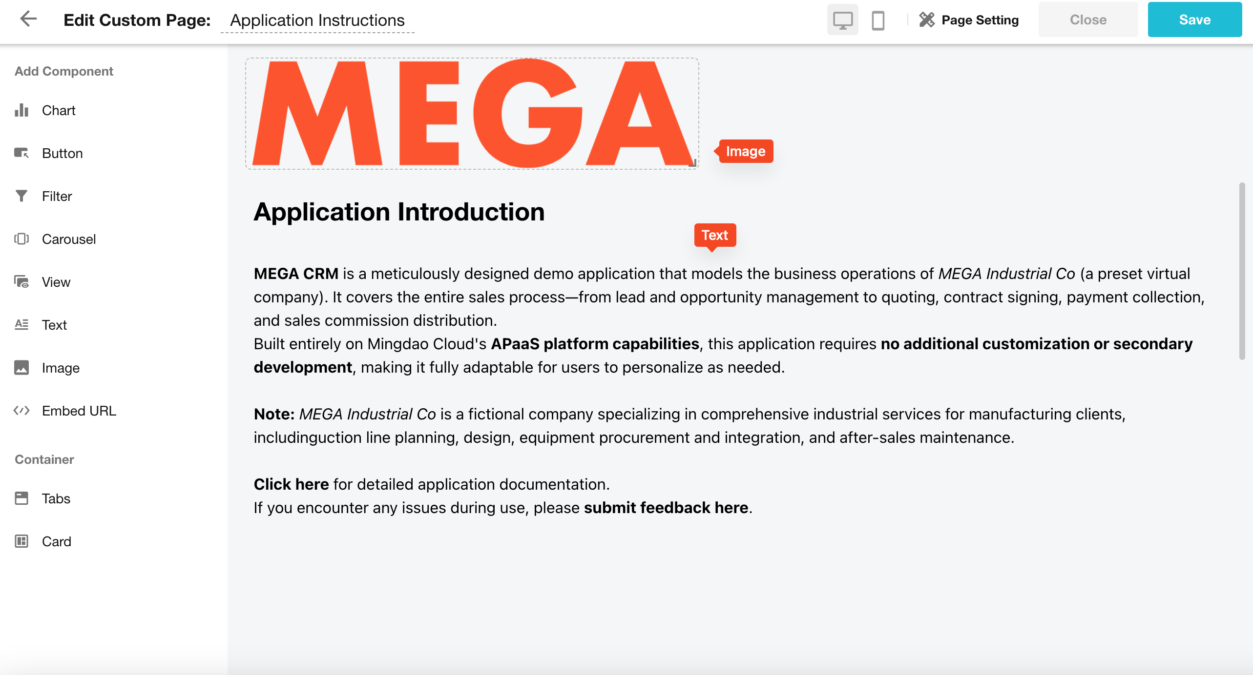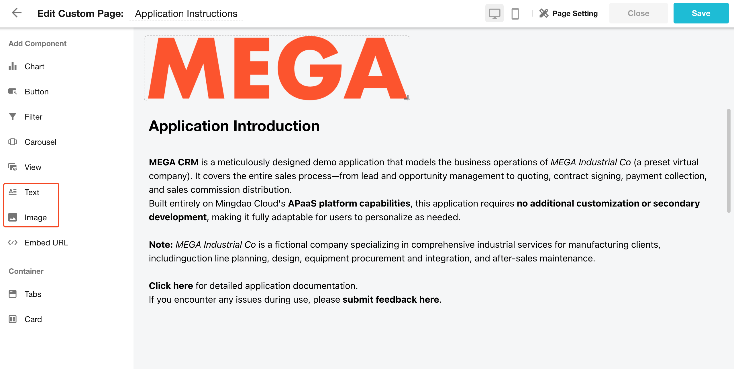 In a custom page, users can freely add Text and Image components. By flexibly adjusting headings and text styling, you can provide professional explanations for data analysis results. The image component supports embedding high-resolution PNG or JPG images, making it easy to incorporate company logos or brand visuals—ideal for both data presentation and brand communication.