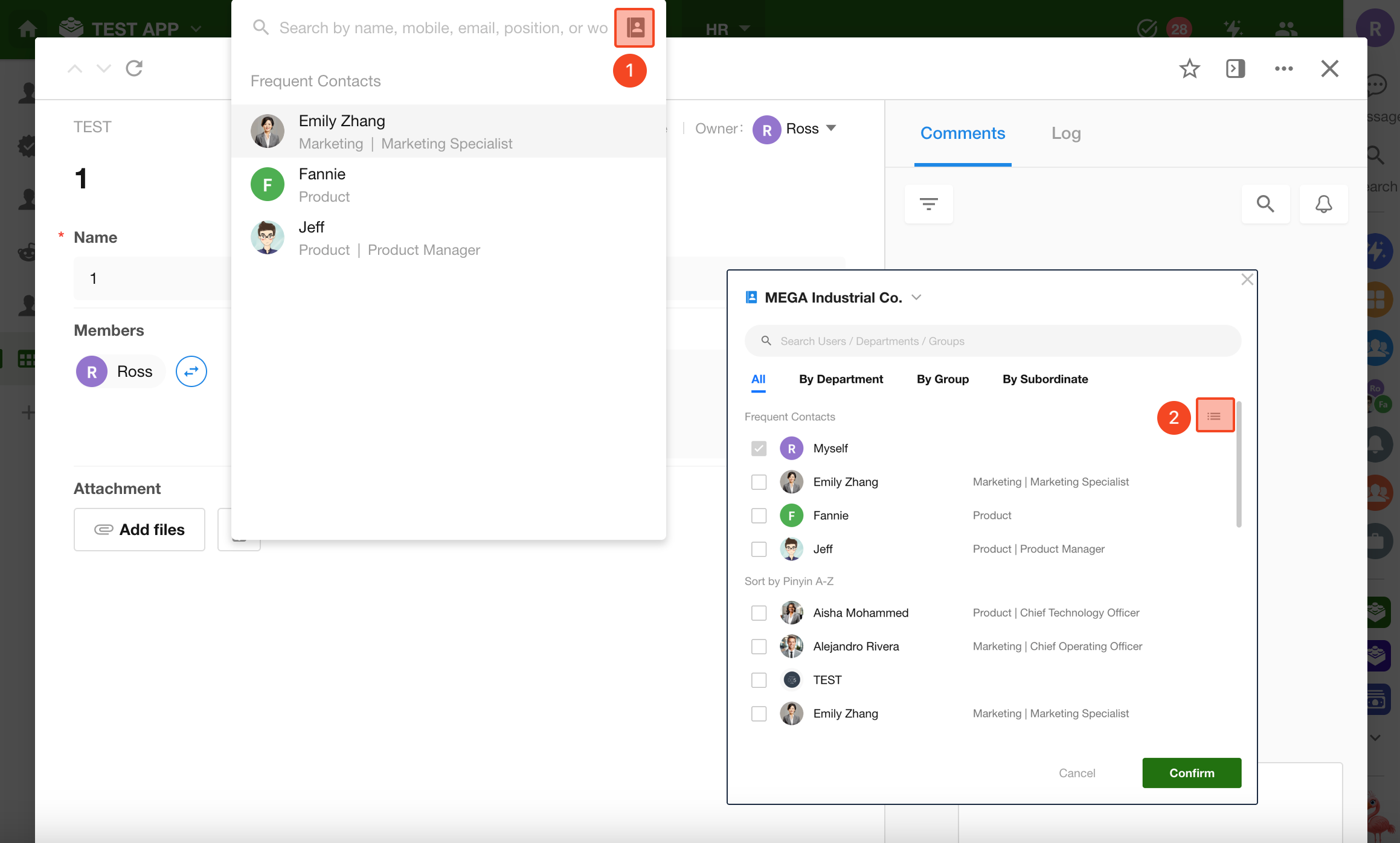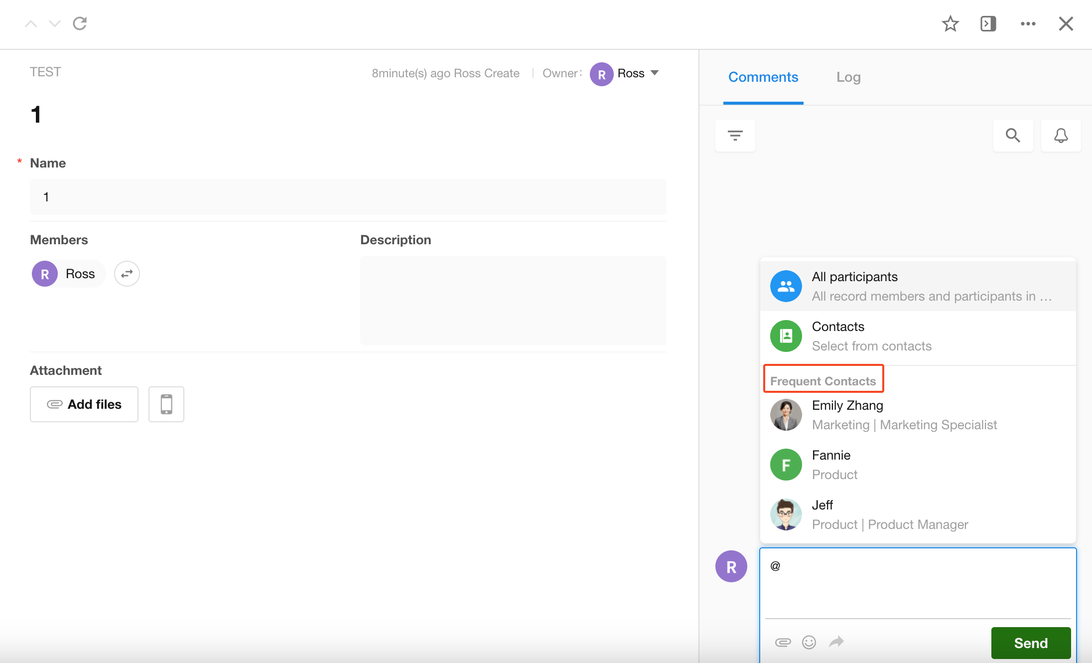 When mentioning someone in a record discussion or when adding members, a list of frequently collaborated users will appear.
