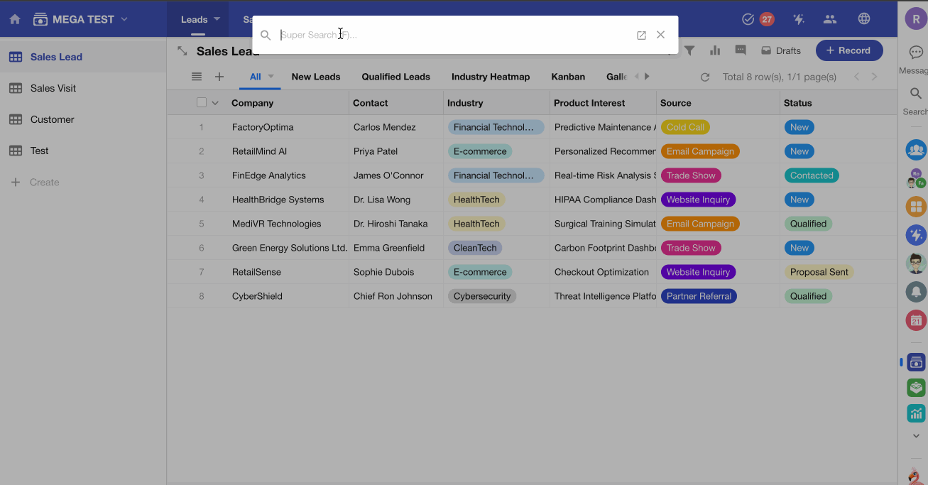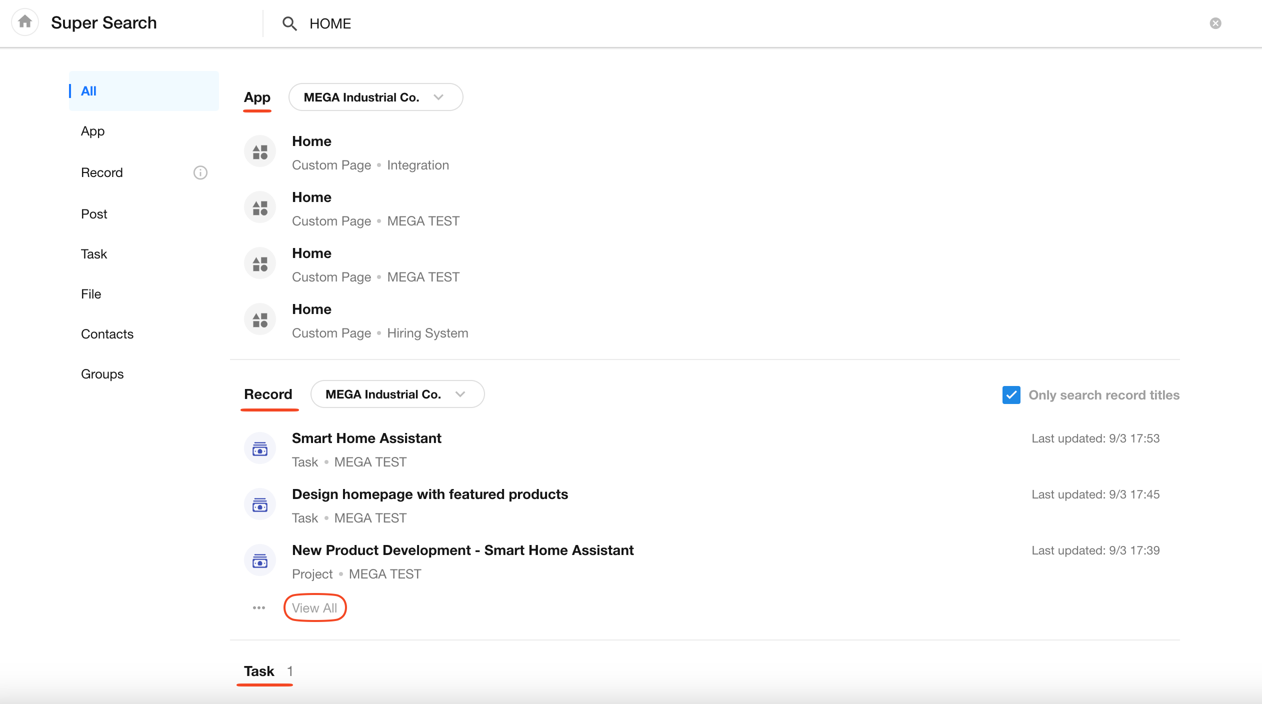 Super Search Engine (SSE) is a unified entry point for quickly searching content across the entire platform. It allows you to search across all apps, records, posts, tasks, files, groups, and contacts within your organization—helping you efficiently locate target content and improve productivity.