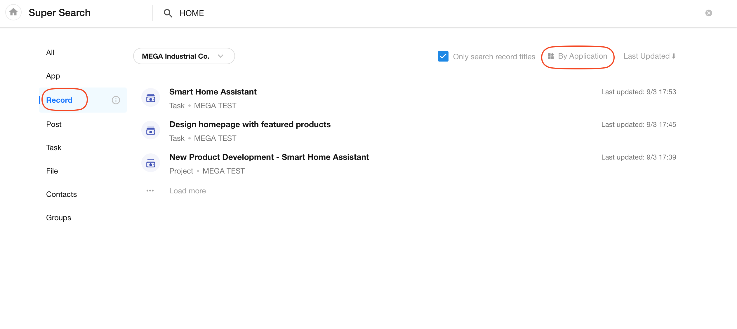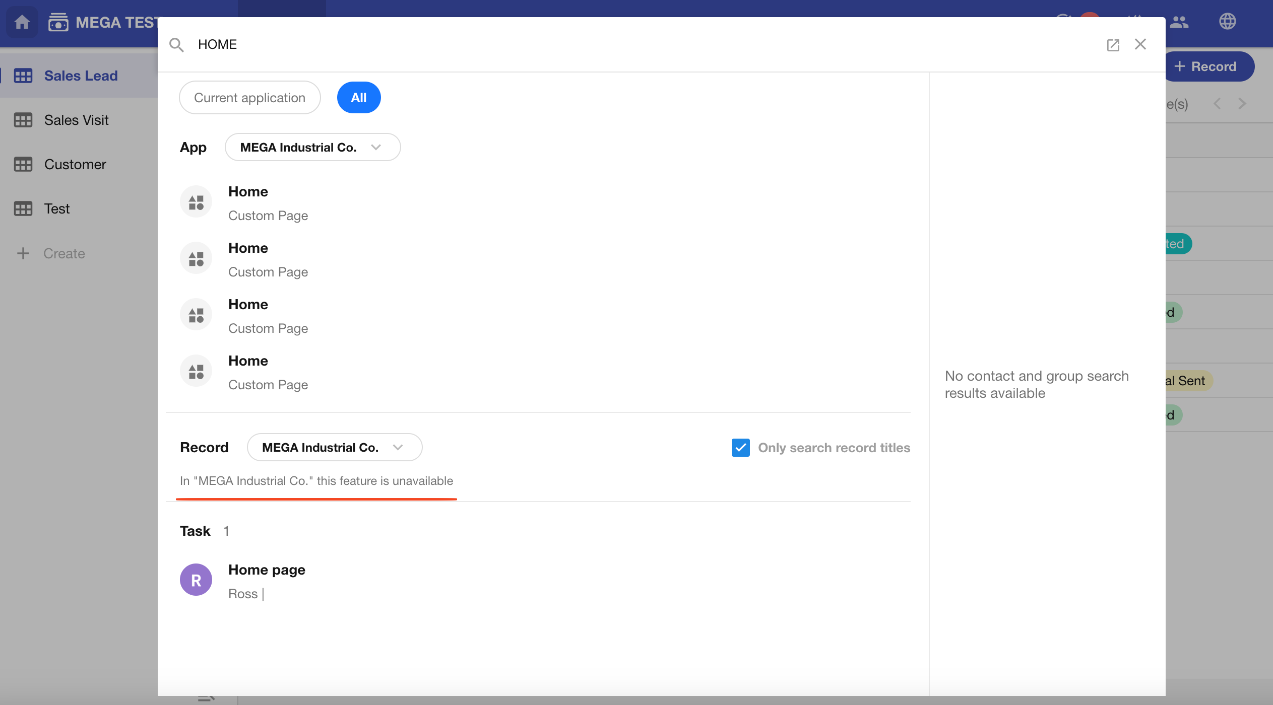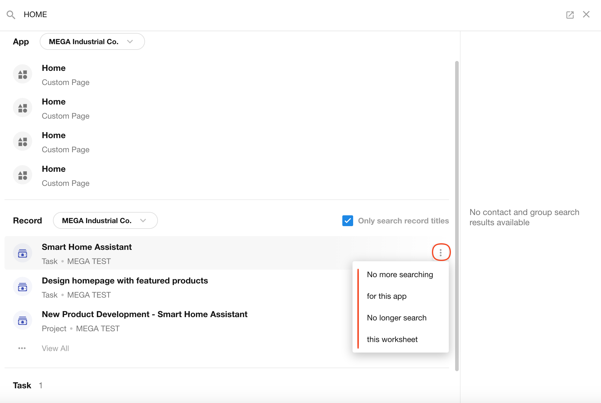 If the search box is triggered within an app, only content from that specific app (such as app groups, worksheet names, and records) will be searched. Other apps and modules (posts, tasks, files) are excluded.