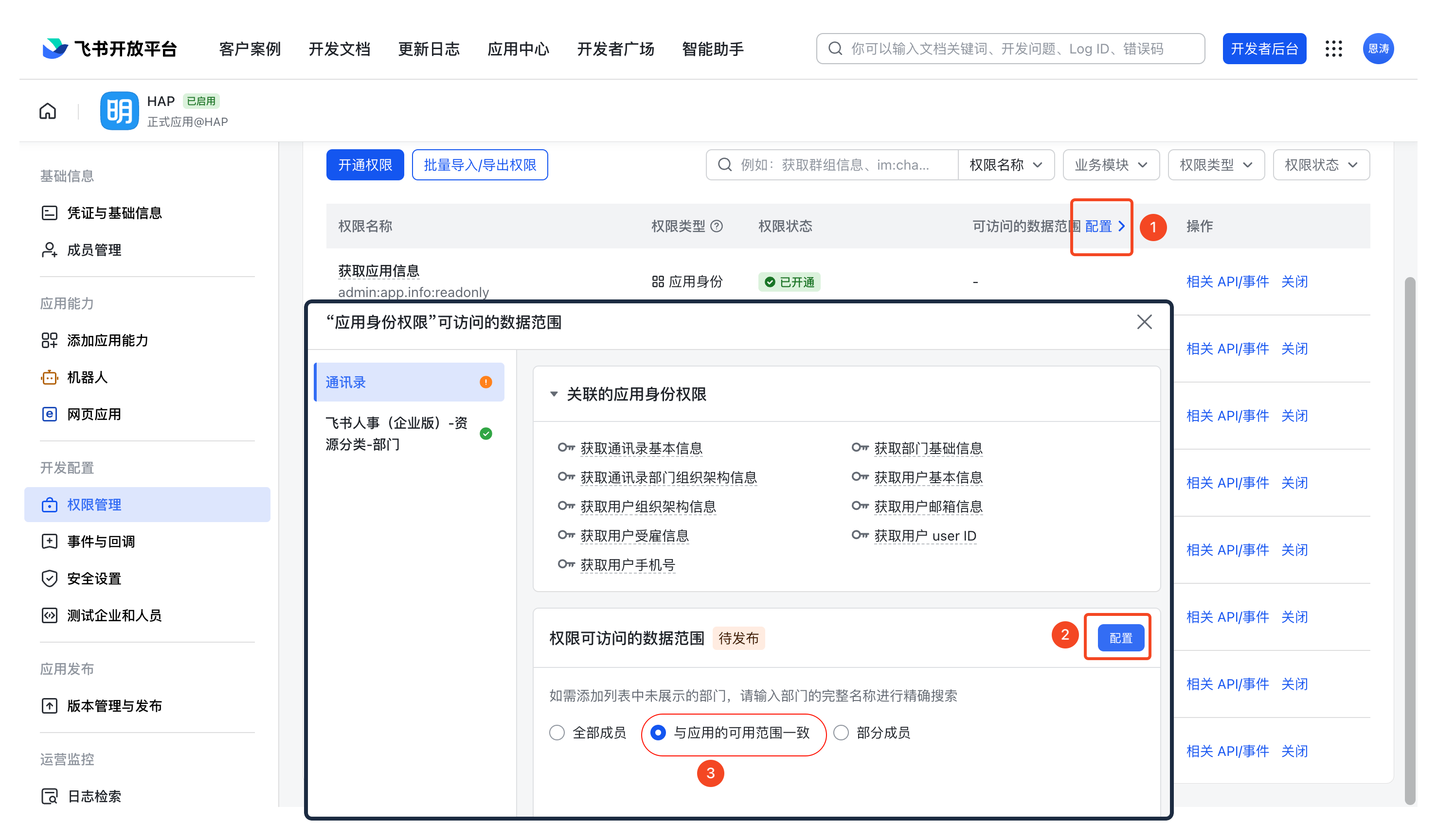 1、确定好使用HAP的飞书账号范围, 范围设置参考本文第9步。