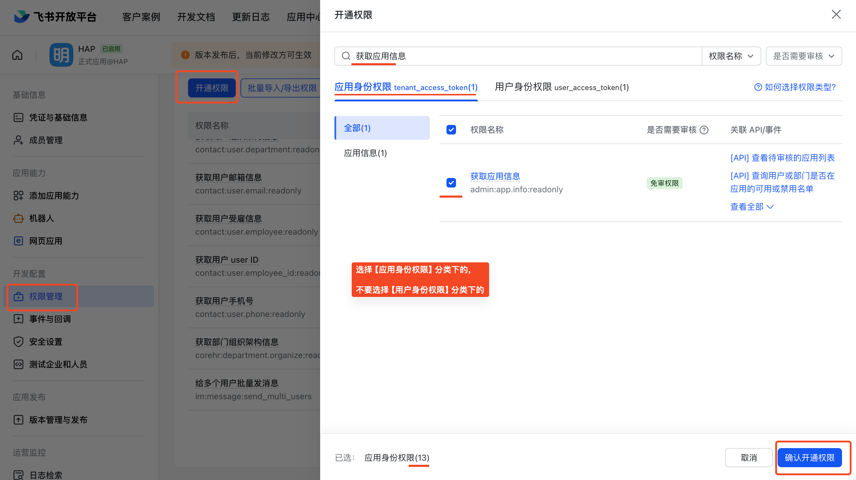 在“开发配置”-“权限管理”中,点击“开通权限”按钮,添加15个接口的权限(应用身份权限)。