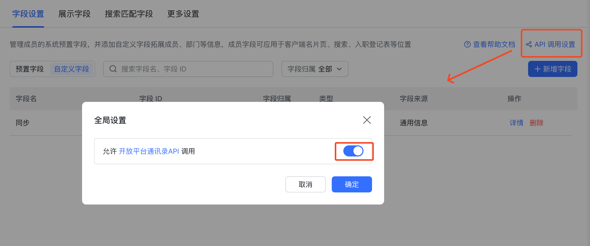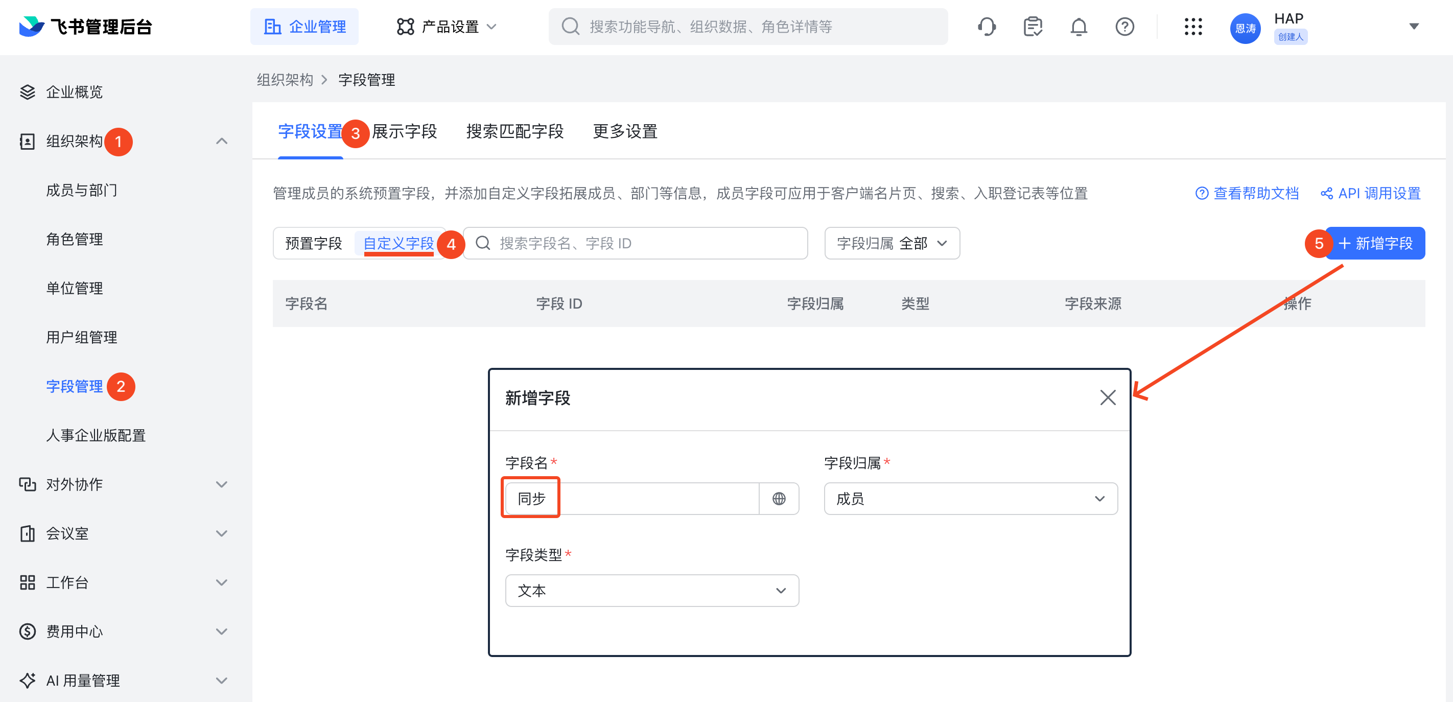 在飞书/Lark中添加自定义字段,管理员依次进入“管理后台”-“组织架构”-“字段管理”,切换为“自定义字段”,然后点击"+新增字段"按钮, 新字段名称为“同步”,归属于“成员”, 类型为“文本”。
