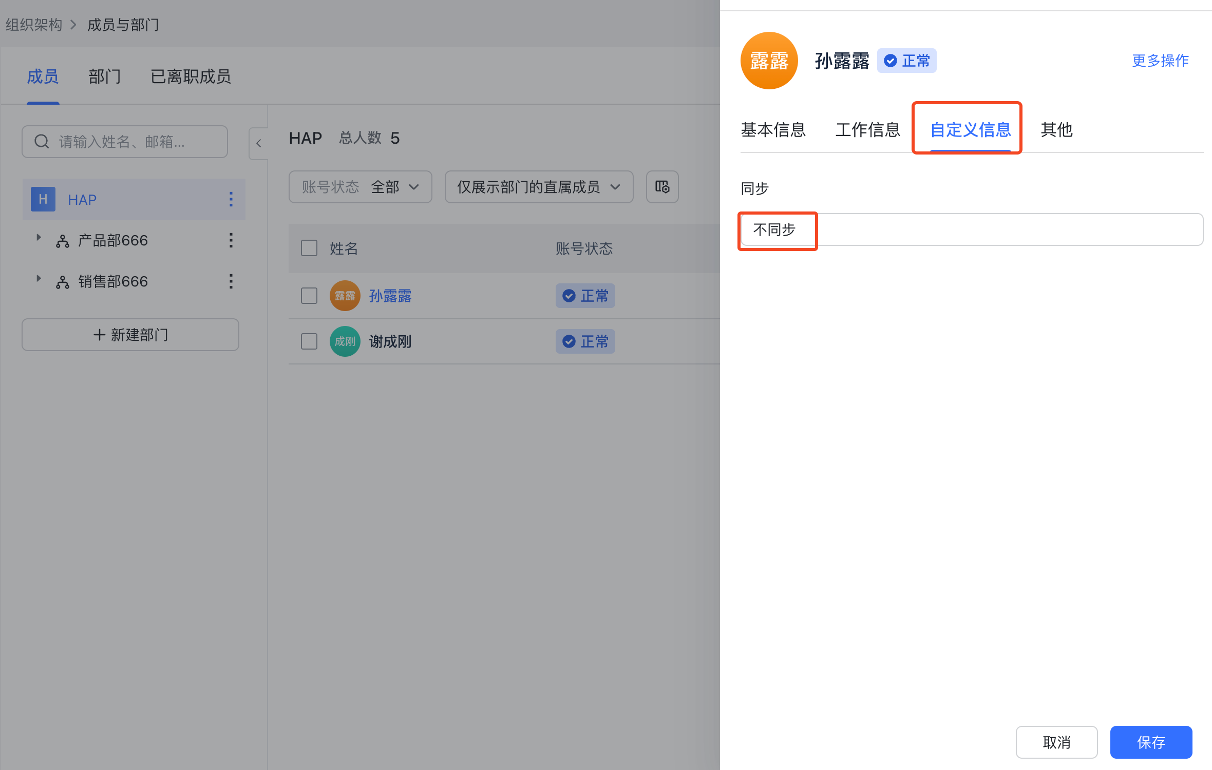 如果您想同步完整的部门结构,又有一些用户不想同步到HAP(如实习生、兼职人员),您可在飞书/Lark的组织架构中添加自定义文本信息字段命名为“同步”,HAP会识别此标识且不进行同步。
