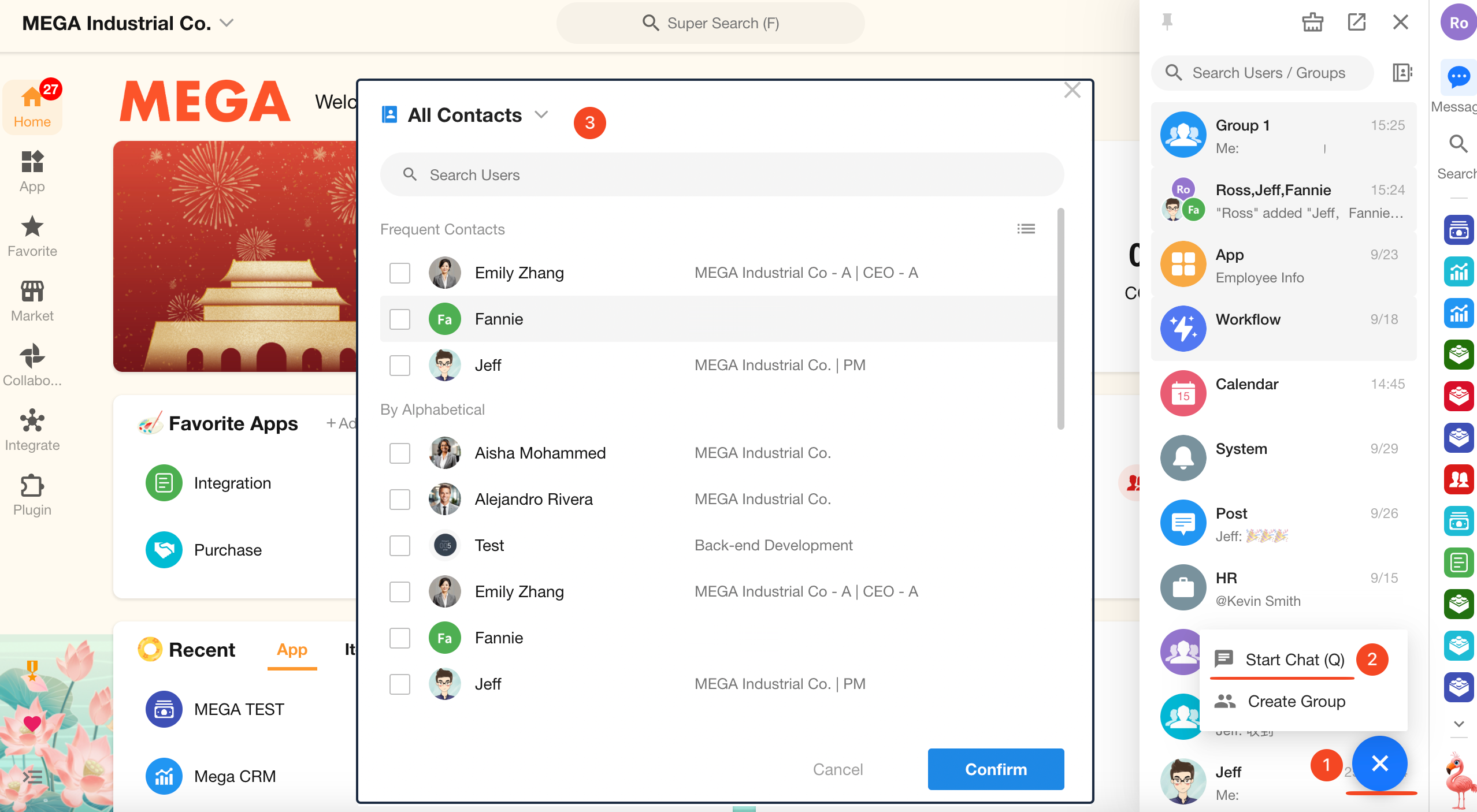 Both groups and chats support multi-person conversations. Click the "+" button in the Messages sidebar to quickly create a group or start a chat.