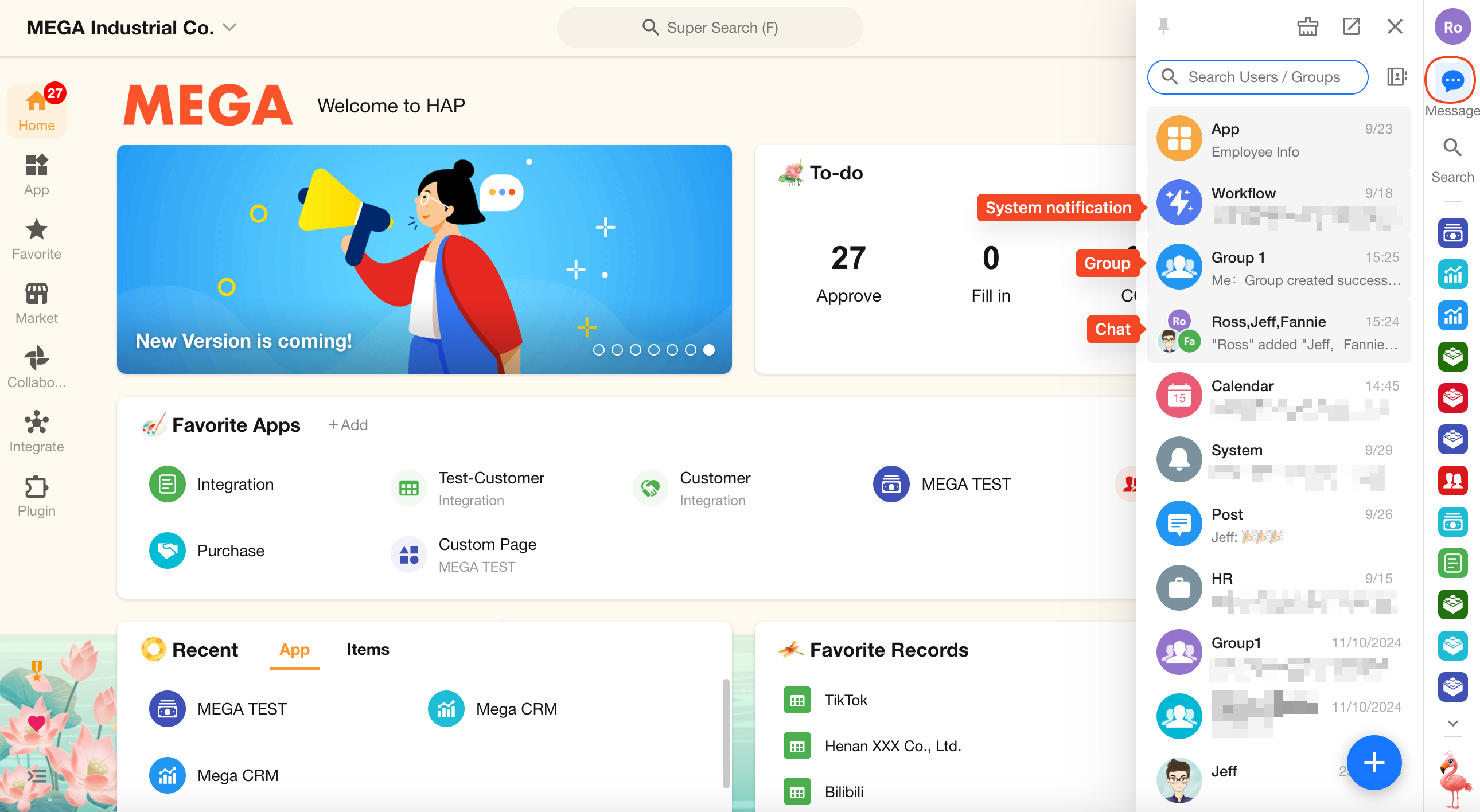 You can start or view chats from any page. It includes group chats, private chats, as well as system and application notifications.
