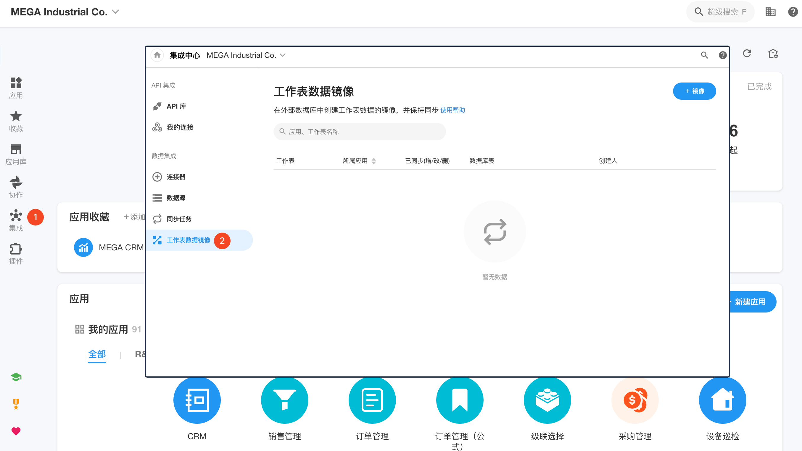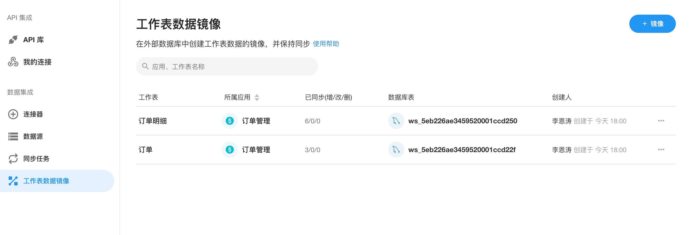 在首页依次点击导航中的“集成” > “数据集成” > "工作表数据镜像" 进入管理页面。