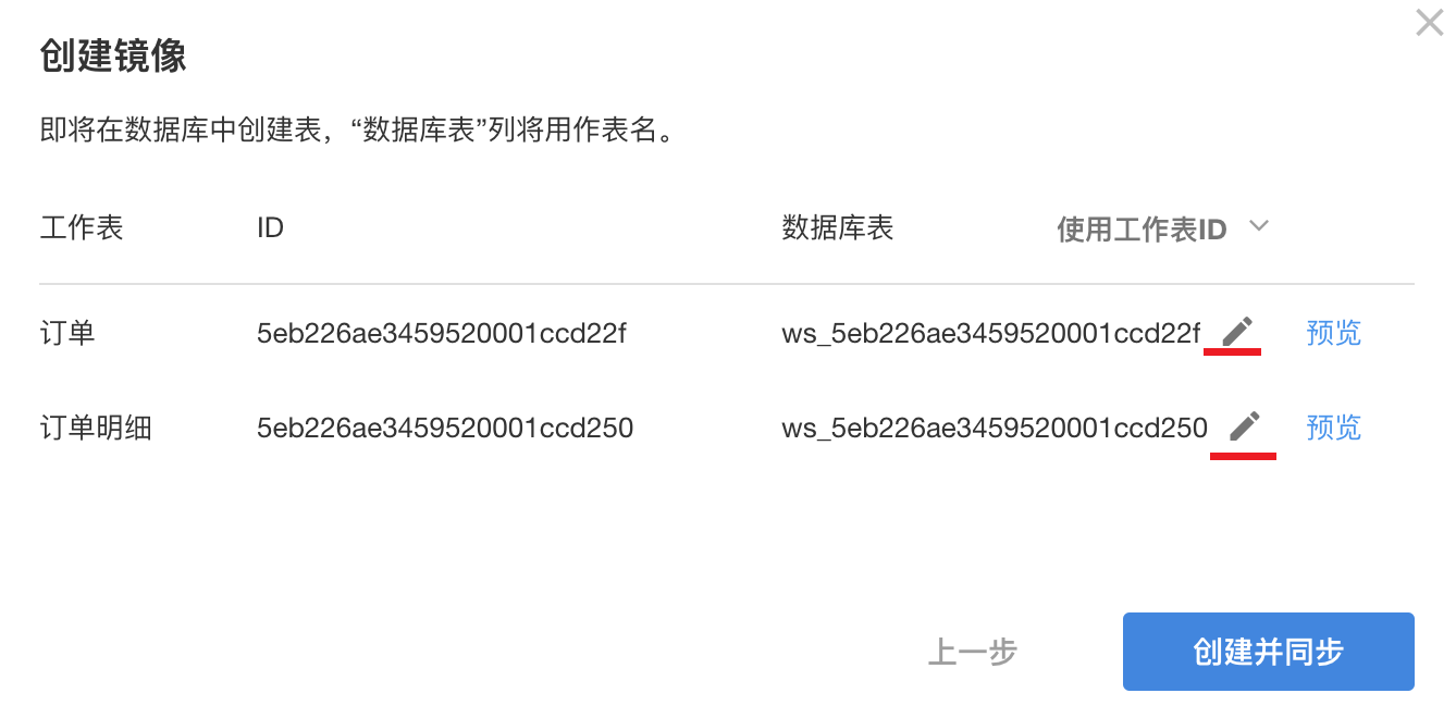 创建完成后,会自动创建每个表对应的镜像,可以预览数据、删除镜像。