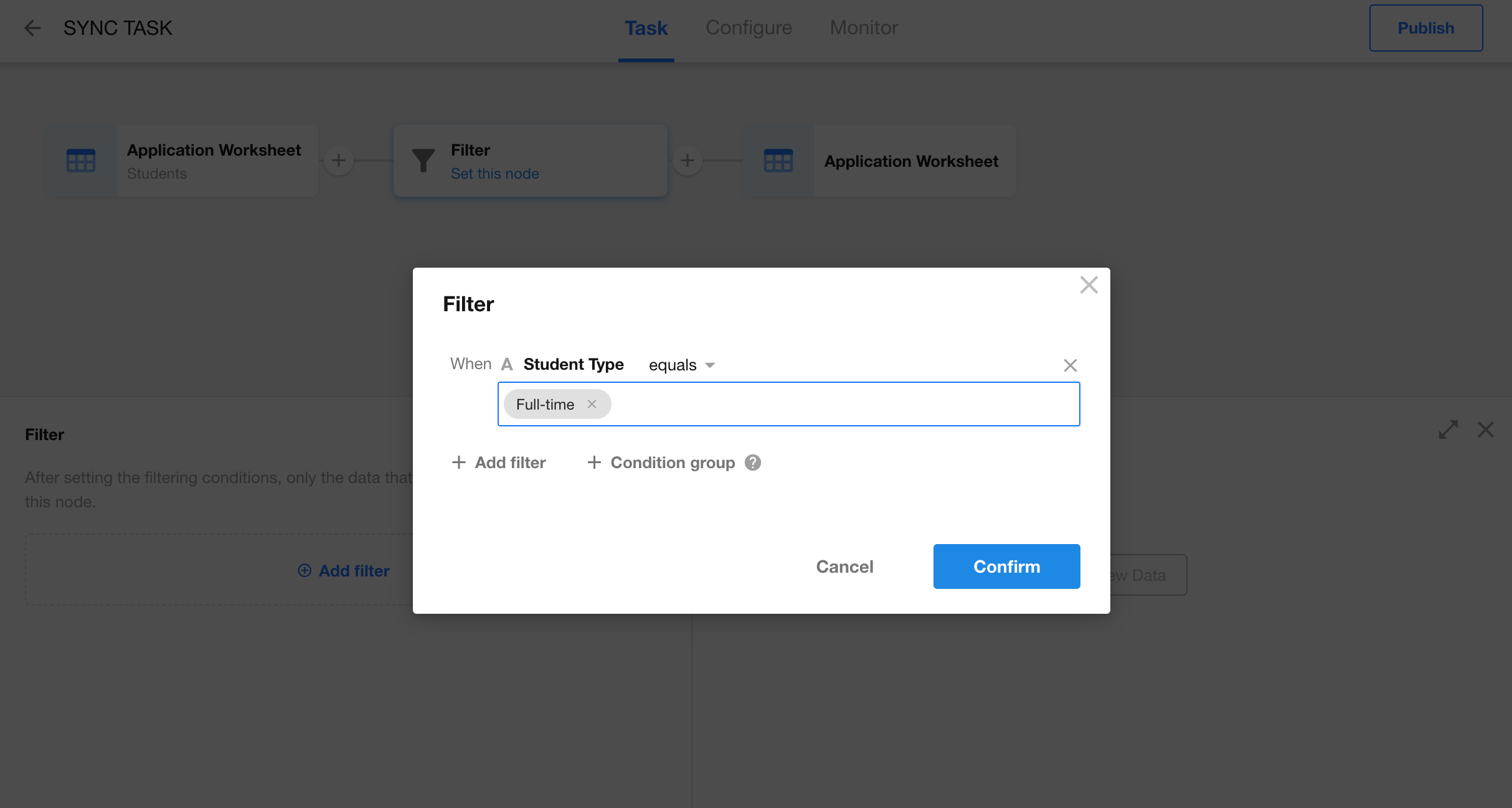 The Filter node allows you to screen data during the sync process. Only the filtered data will be processed and passed to the next node.