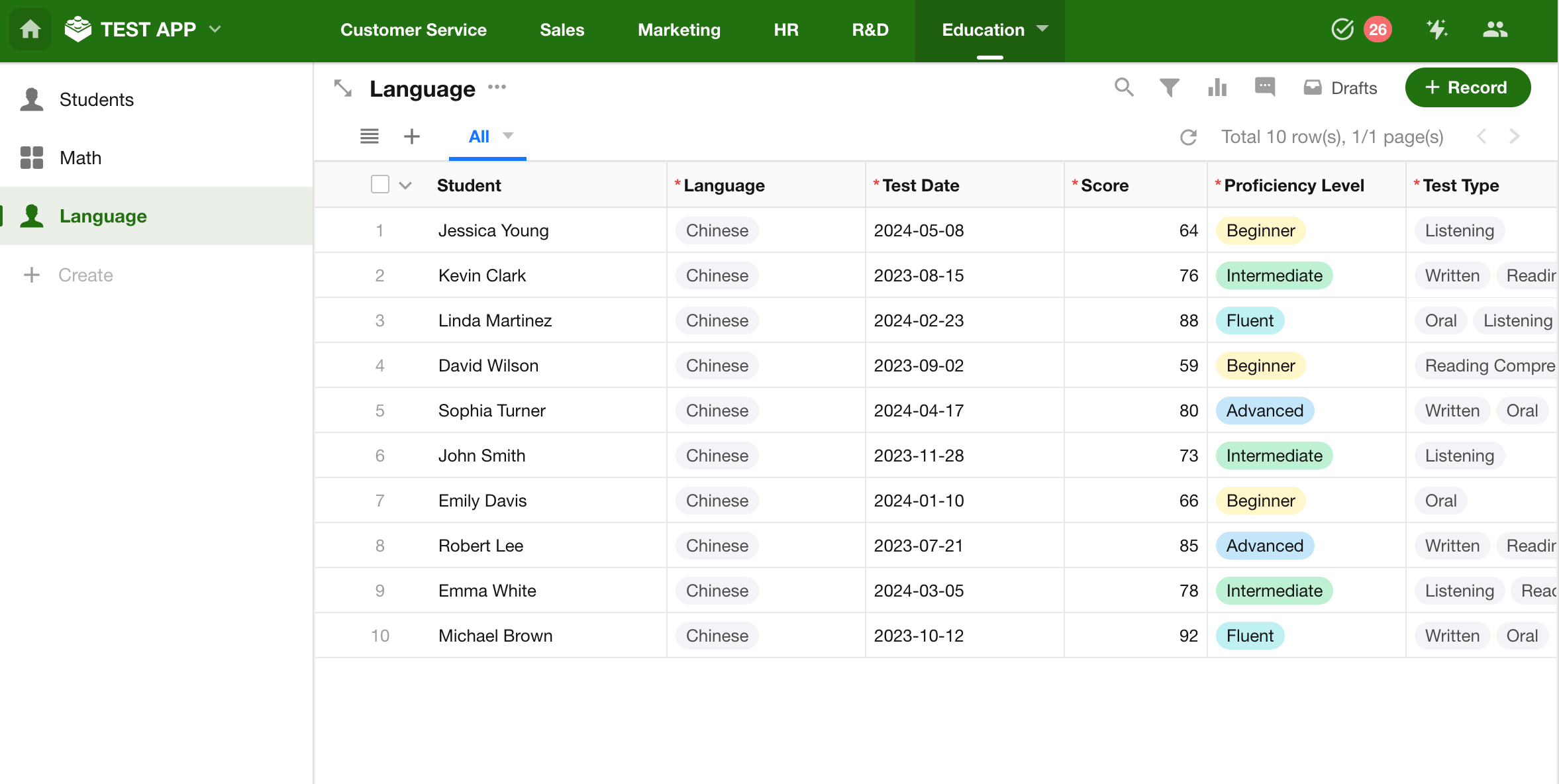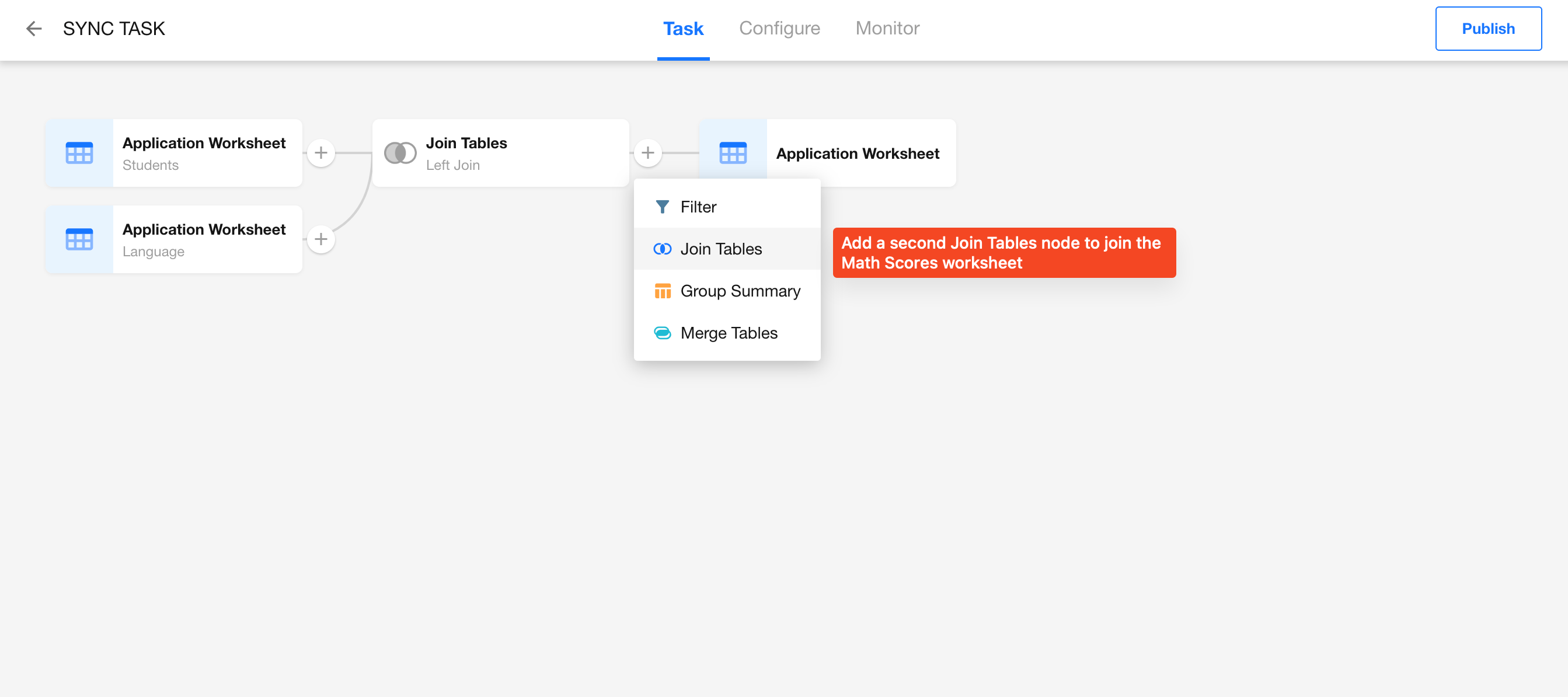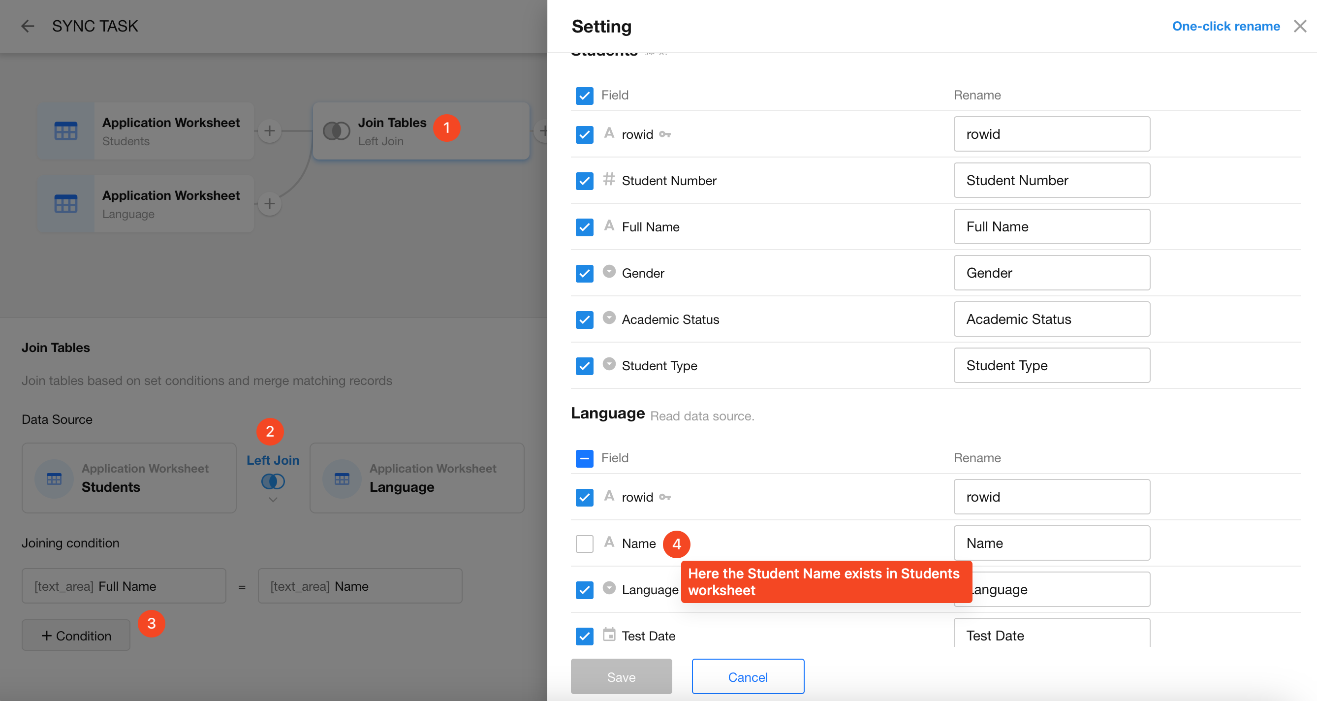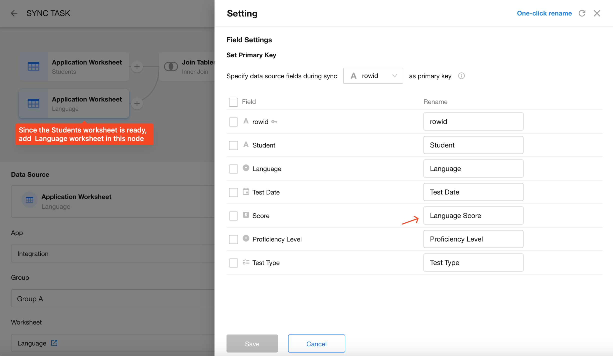 - Join Tables: Configure a Left Join between the Students worksheet and the Language Scores worksheet.