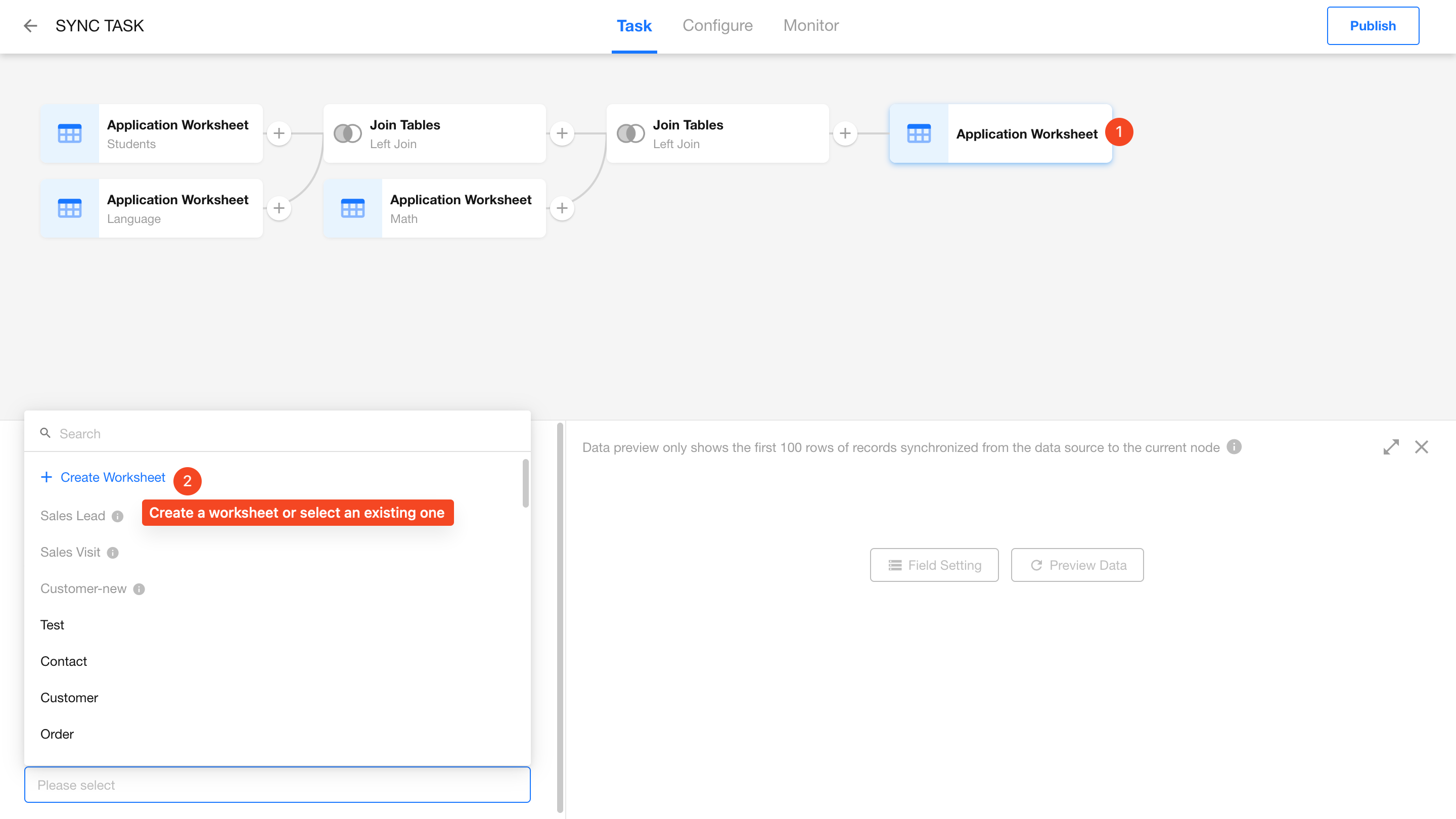 First, select the data source. Then return to the Join Tables node to set up the join fields and conditions.